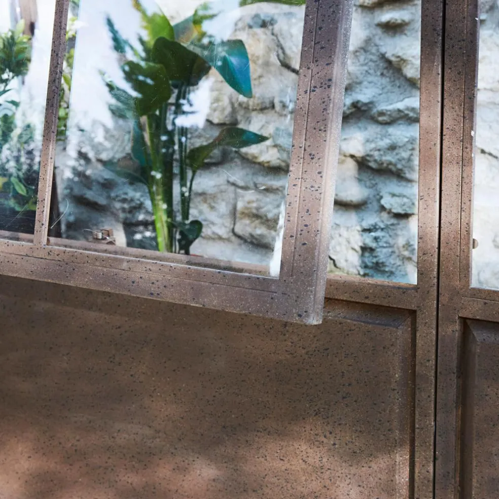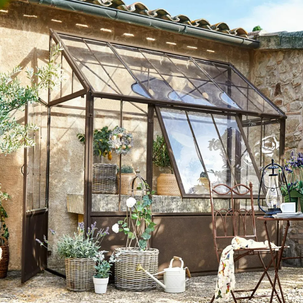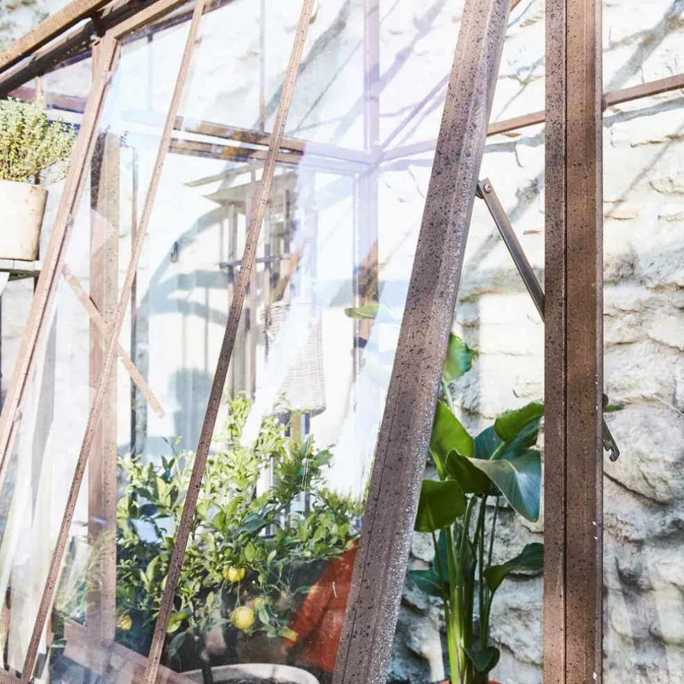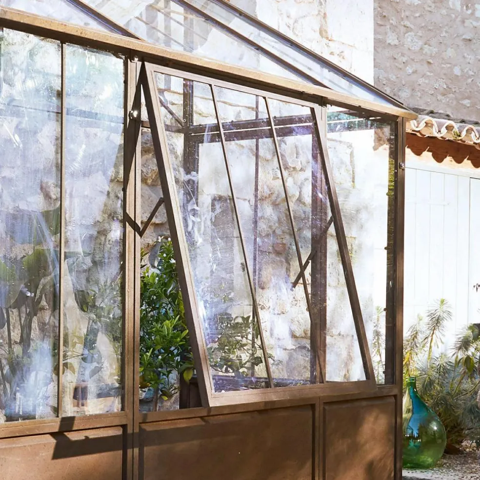 Dieses Gewächshaus wirkt durch sein authentisches Antik-Design absolut einzigartig. Die robuste Konstruktion ist darauf ausgelegt, an einer Wand positioniert zu werden und bietet selbst großen Baumgewächsen ausreichend Raum. Um Witterungsbeständigkeit zu gewährleisten, kommen bei der Herstellung ausschließlich Eisen und eine hochwertige Acrylverglasung zum Einsatz. Die besondere Material- und Herstellungsqualität machen das Gewächshaus absolut regenbeständig und frostresistent. Betreten lässt sich das Gewächshaus durch je eine seitlich angebrachte Tür. Für Belüftung sorgt ein großes Fenster, das sich von unten her kippen lässt. So bekommen Ihre Pflanzen auch immer ausreichend viel Luft und können in sicherer Umgebung bestens gedeihen.