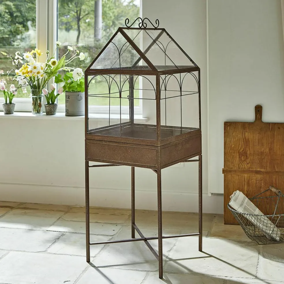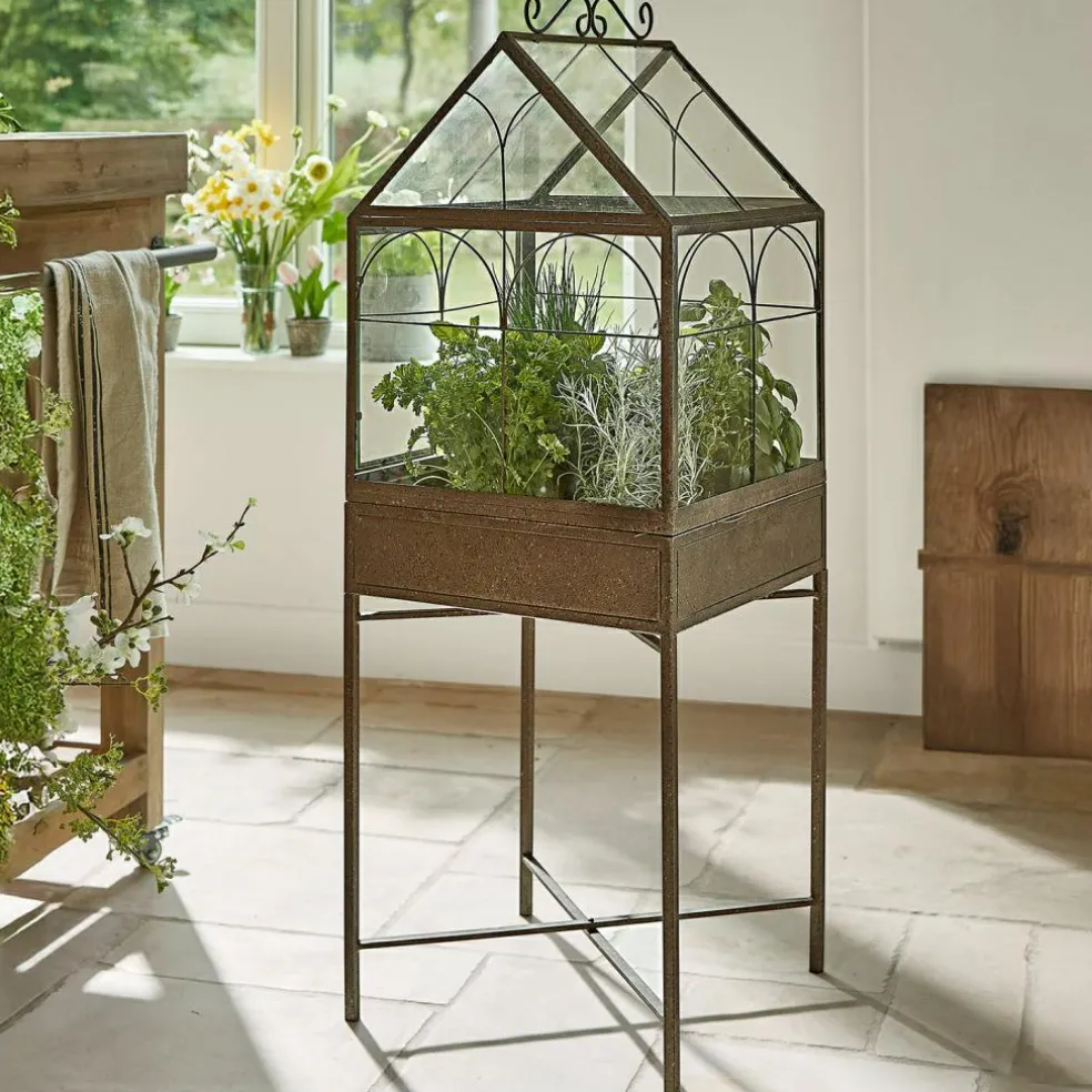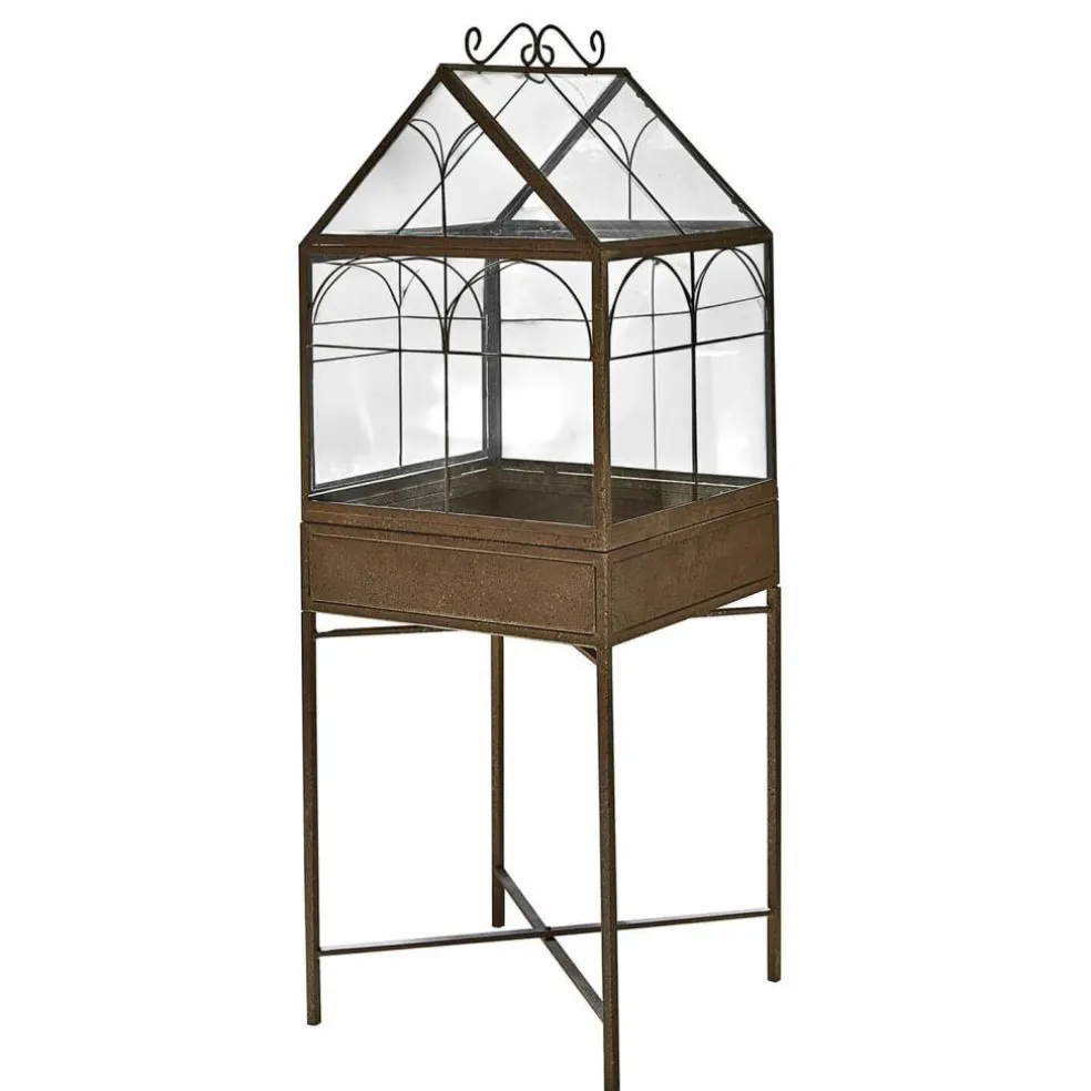 Das Indoor-Gewächshaus besticht durch sein nostalgisches Design und die robuste Verarbeitung aus Eisen. Die kunstvoll geschwungenen Details und das Antikbraun-Finish machen es zu einem echten Schmuckstück, das Ihrem Interieur einen rustikalen Akzent verleiht. Dank der raffiniert eingesetzten PVC-Paneele, die den Look von echtem Glas perfekt imitieren, wird das Gewächshaus zur idealen Bühne für Ihre Pflanzen. Platzieren Sie es im Wohnzimmer, der Küche oder auf der Fensterbank und lassen Sie Ihre grünen Lieblinge stilvoll erstrahlen. Ein charmantes Detail: Die verzierte Verschlusstechnik fügt einen zusätzlichen Vintage-Touch hinzu. Sollten Sie das Gewächshaus im Freien aufstellen wollen, sollten Sie dies in einem überdachten Bereich tun, damit Ihnen der Artikel so lange wie möglich erhalten bleibt.