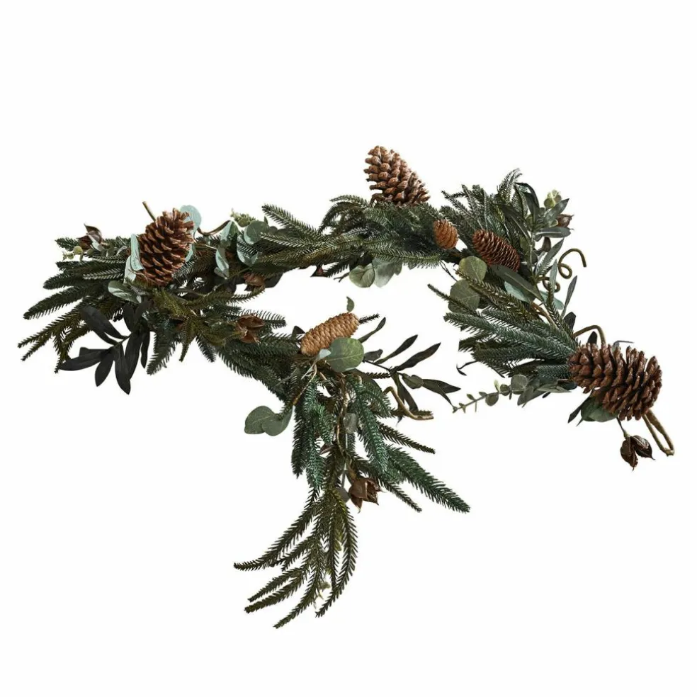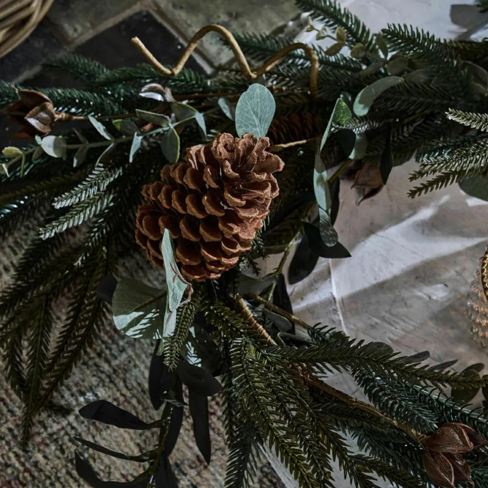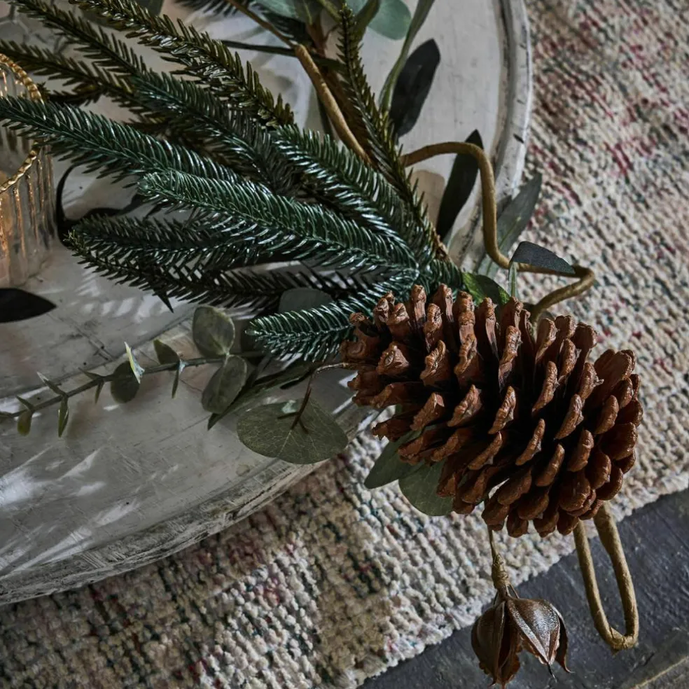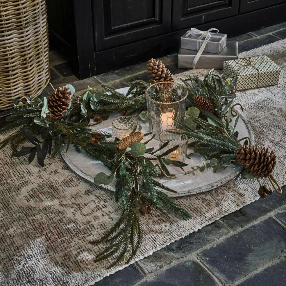 Wie frisch aus dem Wald geholt, verströmt diese Girlande eine ruhige, natürliche Winterstimmung – ganz ohne zu nadeln. Zwischen zart grün schimmernden Tannenzweigen, gewundenem Dekodraht und matten Eukalyptusblättern sitzen echte Tannenzapfen, die für Authentizität und Textur sorgen. Die verschiedenen Grüntöne, kombiniert mit der warmen Braunnuance der Zapfen, schaffen ein harmonisches Gesamtbild, das sowohl rustikale als auch moderne Einrichtungsstile ergänzt. Dank des biegsamen Drahtkerns lässt sich die Girlande spielend leicht in Form bringen – ob als verspielter Rahmen auf dem Esstisch, geschwungen über einem Spiegel oder kunstvoll um das Treppengeländer gelegt. Ein vielseitiges Natur-Arrangement, das Wärme und Festlichkeit ausstrahlt.