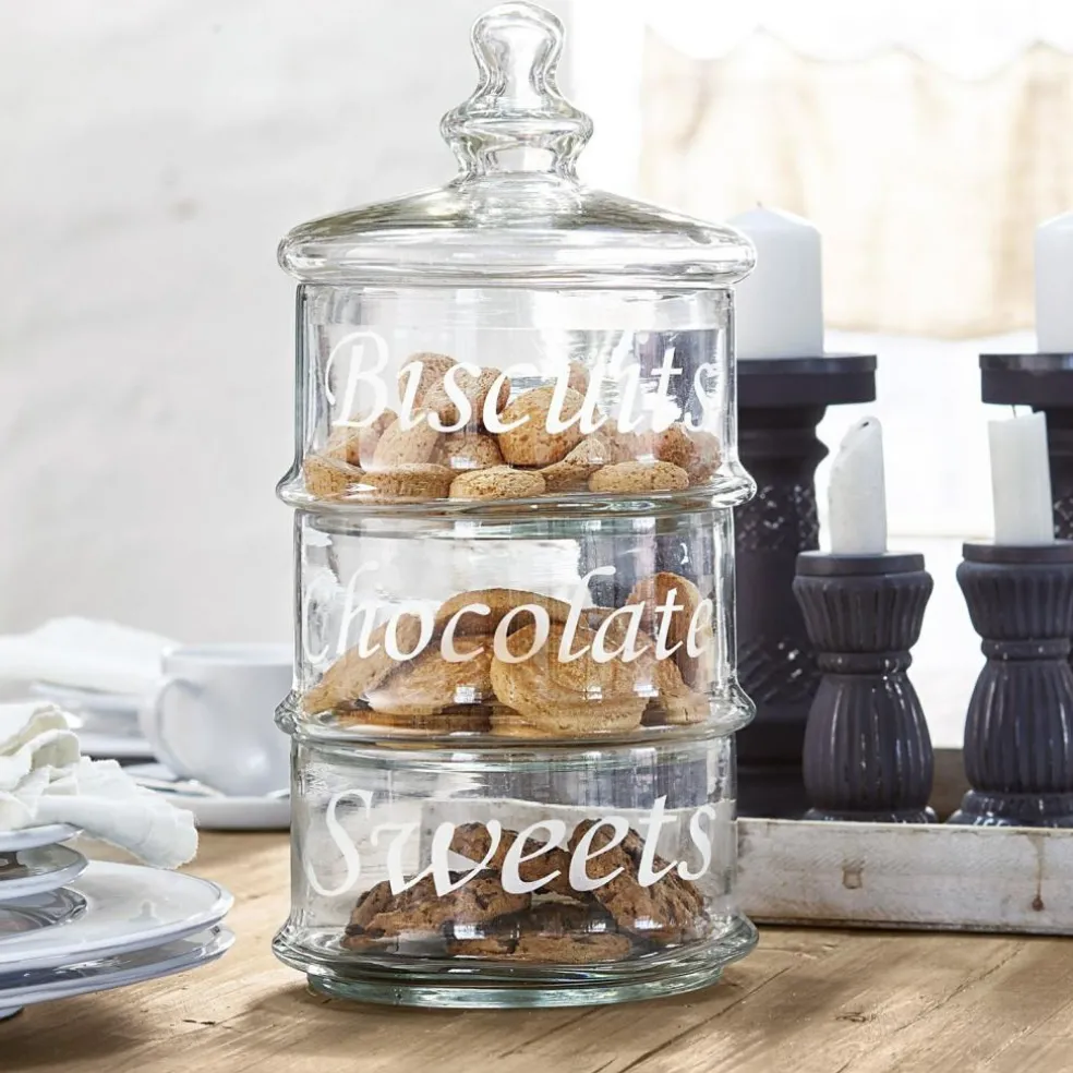 „Sweets“, „Chocolates“ oder „Bisquits“ – welche süße Leckerei darf es zuerst sein? Köstliches Naschwerk aller Art findet in dem schönen gläsernen Modell das ideale Plätzchen. Das dreistöckige Design aus klarem Glas ist stapelbar und wird oben mit einem Glasdeckel mit Knauf geschlossen. So bleibt alles sauber und hygienisch verwahrt, und auch die Reinigung geht ganz einfach von der Hand. Auch Tee, Zucker und andere Köstlichkeiten lassen sich so vorzüglich verstauen. Durch das klare Glas haben Sie zudem jederzeit den Überblick über Ihre Vorräte. Manchmal müssen es einfach ein paar kleine Naschereien sein, um den Tag perfekt zu machen – gut, wenn man sie jederzeit griffbereit hat.
