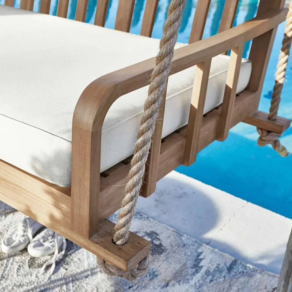 Einfach mal die Füße und die Seele baumeln lassen: Mit dieser wundervollen Hängebank genießen Sie unbeschwerte Stunden im Freien. Die schicke Entspannungsinsel kann einfach mit den festen Jutekordeln, die nach oben hin zusammenlaufen, an Holzvorsprüngen oder an einer Decke befestigt werden. Für das Gefühl der schwebenden Leichtigkeit sorgen auch die wunderbar weichen Kissen mit ihren Bezügen aus Olefinfasern. Sie sind abziehbar und waschbar, brauchen aber im Grunde kaum Pflege, denn das Material ist sehr widerstandsfähig. So wie auch das Teakholz, aus dem die Hängebank besteht. Es besticht nicht nur durch seine aparte natürliche Maserung, sondern eben auch durch seine Robustheit, mit dem es Wind und Wetter trotzt. Definitiv ein Schmuckstück, mit dem Sie über Jahre hinweg viel Freude haben werden. Freuen Sie sich auf traumhafte Augenblicke: Sonnen Sie sich leicht wiegend und sehen Sie dabei den Schmetterlingen in Ihrem sommerlichen Garten zu. Oder genießen Sie stimmungsvolle Momente mit Ihrer Familie oder einen Abend mit Ihren besten Freunden – und stoßen Sie an auf beschwingte Zeiten.