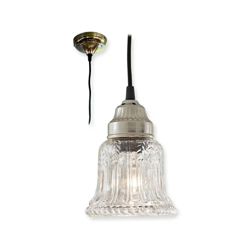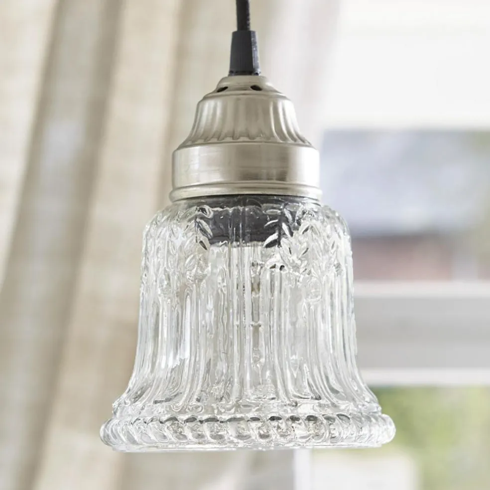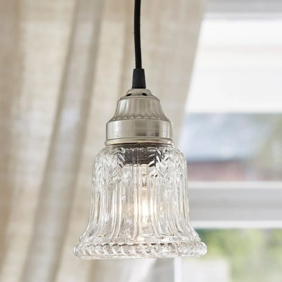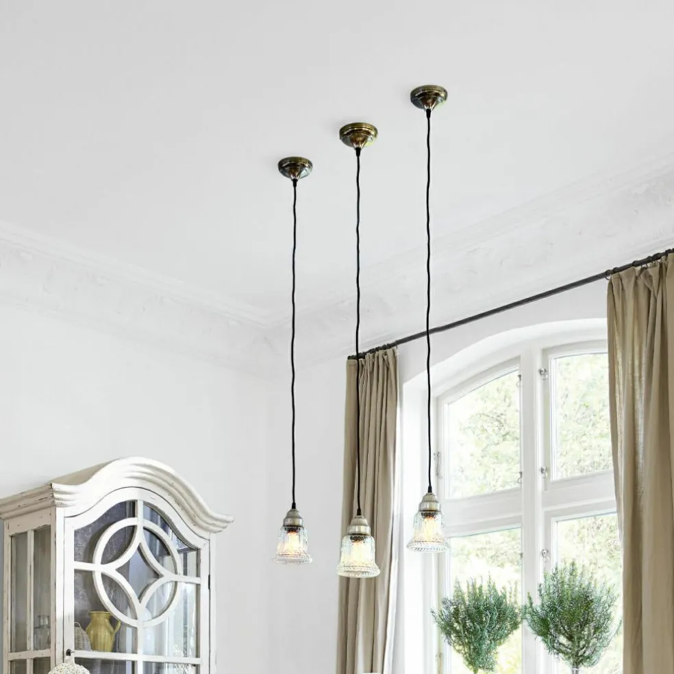 Eine geschmackvoll designte Lampe, die von der Decke hängend Licht spendet. Durch den klaren, gläsernen Lampenschirm schimmert es ungefiltert hindurch und illuminiert Ihre Räume auf stilvolle Weise. Ein echter Schatz im edlen Industrial-Stil. Das schnörkellose, klare und puristische Design bezaubertmit seinem besonderen Flair. Der formschöne Baldachin besteht aus Eisen, der glockenförmige Lampenschirm aus Glas. Er ist mit einem feinen Muster verziert. Das in der Länge variable Kabel ist mit dunklem Stoff bezogen – ein attraktiver Material-Mix. Variieren Sie die Kabellänge ganz nach Ihren Wünschen und Bedürfnissen. Ein gekonntes und geradliniges Design, das ein geschmackvolles Statement setzt. Unaufdringlich und leicht, aber dabei sehr raffiniert in der Anmutung.