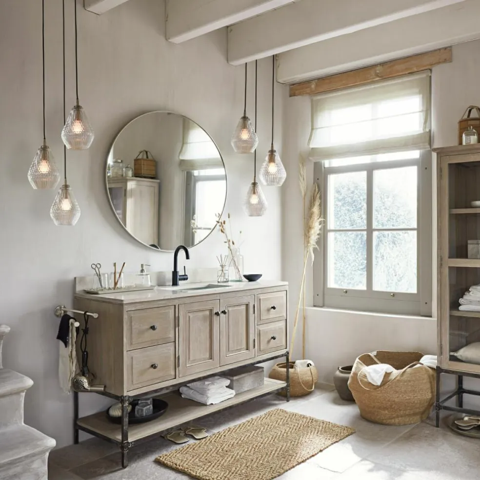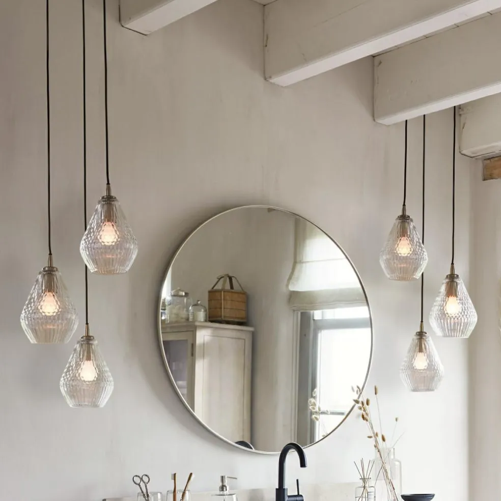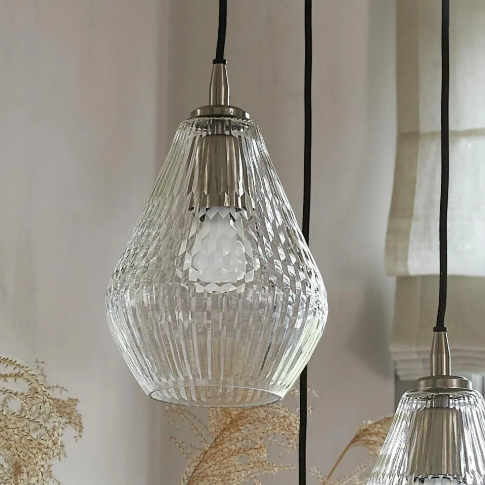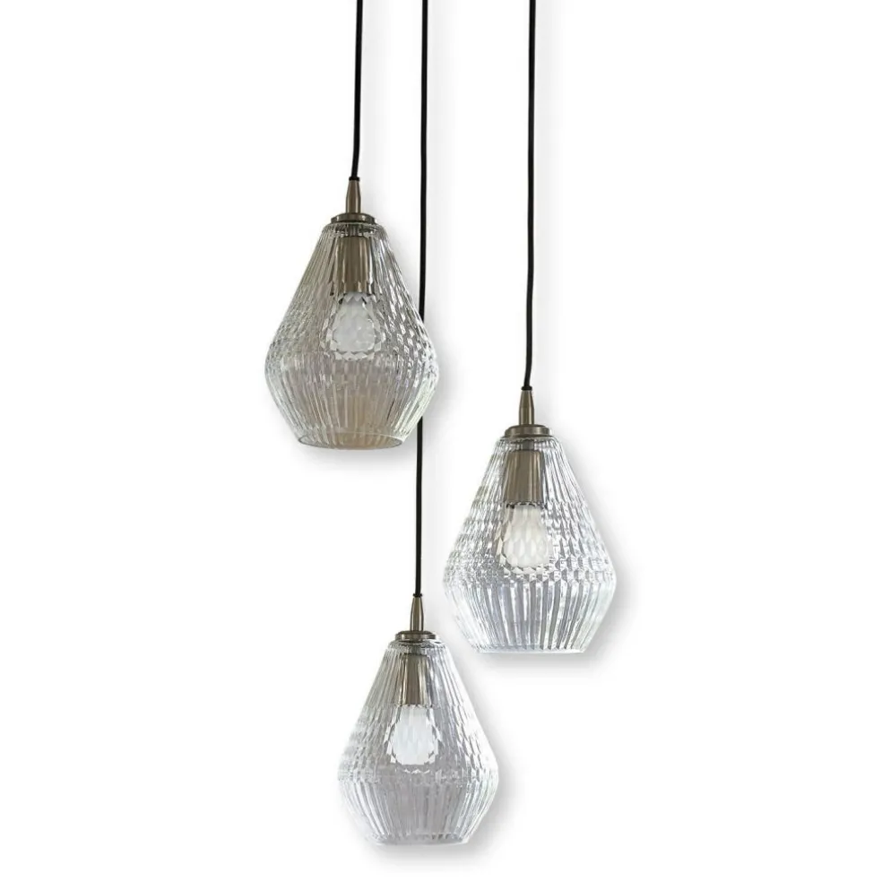 Erfahrene Innenarchitekten wissen, welche Bedeutung Licht für die Wohlfühlqualität von Räumen hat. In besonderem Maße gilt das natürlich für unsere privaten Wohnräume, in denen wir ausspannen, zur Ruhe kommen und relaxen möchten. Sie lieben es, nach einem anstrengenden Arbeitstag in der Badewanne zu entspannen? Dann sollten Sie auch in Ihrem privaten Wellnessbereich eine Lampe haben, deren Licht für einen hohen Gemütlichkeitsfaktor sorgt. Idealerweise verbunden mit einem optisch interessanten Design, das auch dem Auge wohltut, wenn Sie es betrachten. Die drei Glaskörper dieser Hängelampe sind in unterschiedlicher Höhe positioniert, was locker wirkt und zugleich den Vorteil hat, dass sich das Licht angenehm diffus im Raum verteilt. Für einen reizvollen Effekt sorgen die feinen Reliefmuster, mit denen die Lampenkörper verziert sind: Oben und unten fällt das Licht durch ein zartes Streifenmuster, in der Mitte bricht ein interessant geometrisches Muster das Licht. Gehalten werden die drei Lampen von einem Baldachin aus hochwertigem, silberfarbenem Messing, mit dem die Hängelampe an der Decke befestigt wird. Natürlich sind die Lampen an den langen Kabeln höhenverstellbar, so dass Sie genau die Position wählen können, die für Ihren Zweck die richtige ist. Denn vielleicht soll die Hängelampe ja bald Ihren Esstisch beleuchten.