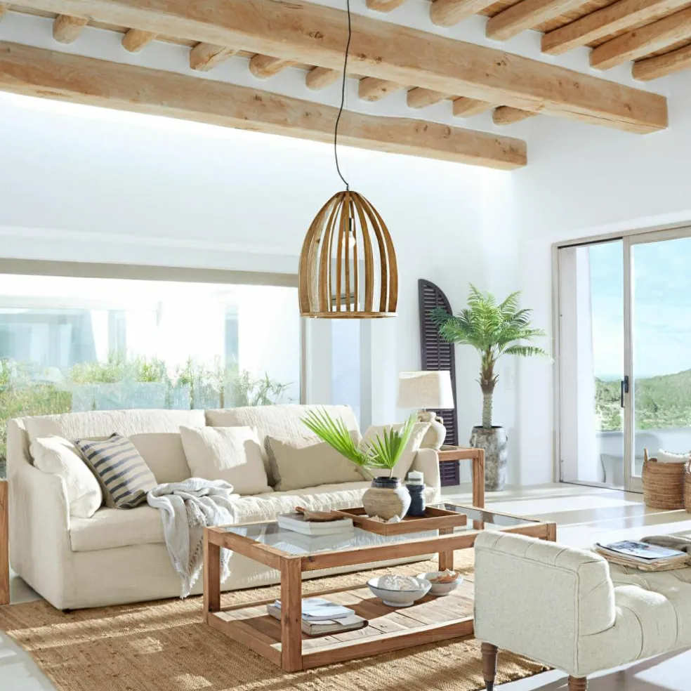 Ein echter Hingucker für alle, die minimalistisches und natürliches Design schätzen. Die Hängelampe aus Mangoholz überzeugt durch ihre klare, offene Form, die skulptural und leicht zugleich wirkt. Das naturbelassene Mangoholz verleiht jedem Raum eine warme und einladende Atmosphäre, während die Holzstreben durch ihre Anordnung für interessante Lichtspiele sorgen. Die Lampe ist nicht nur ein funktionales Leuchtmittel, sondern auch ein stilvolles Designobjekt, das den skandinavischen Look perfekt verkörpert. Ideal für Räume, die eine natürliche, dezente Eleganz ausstrahlen sollen.