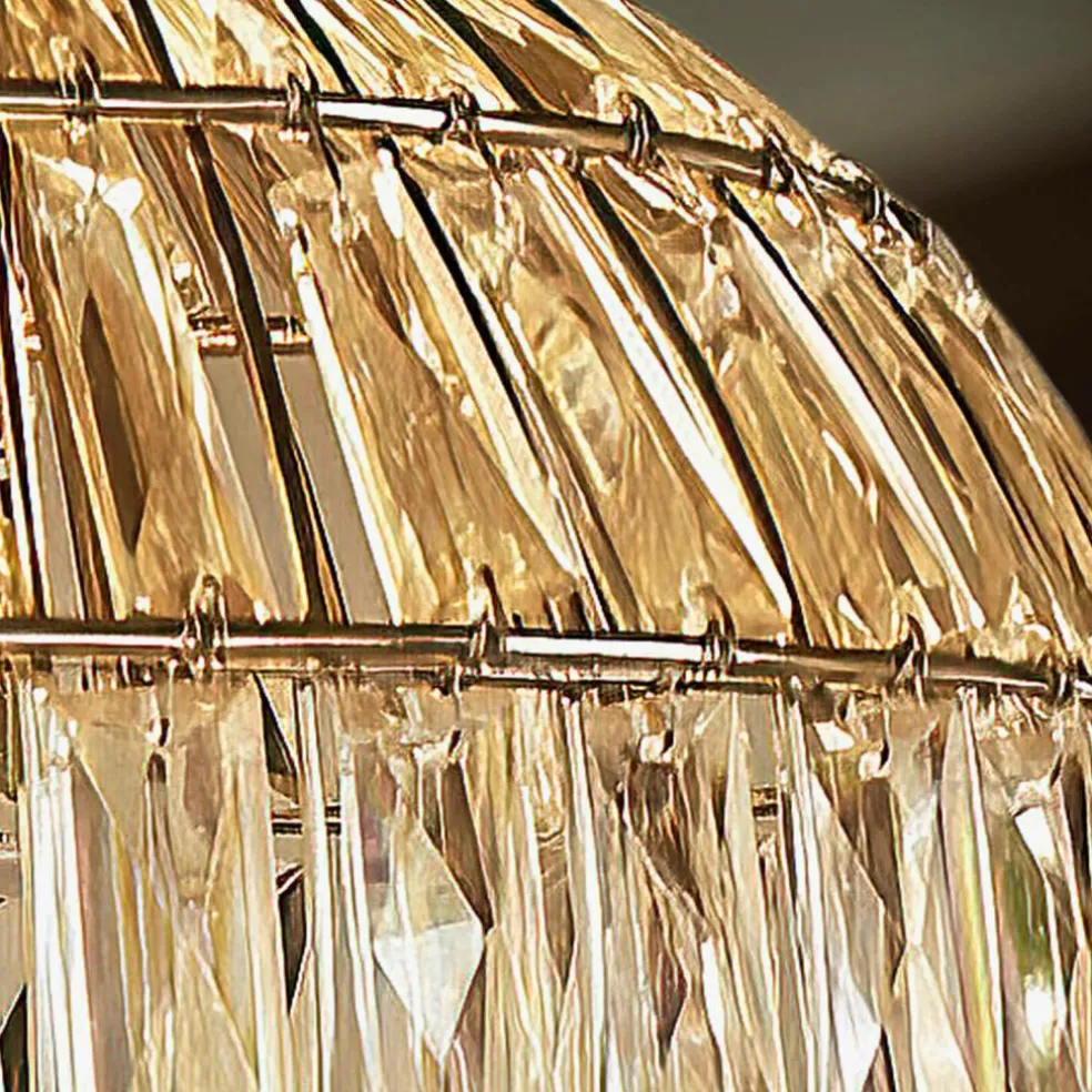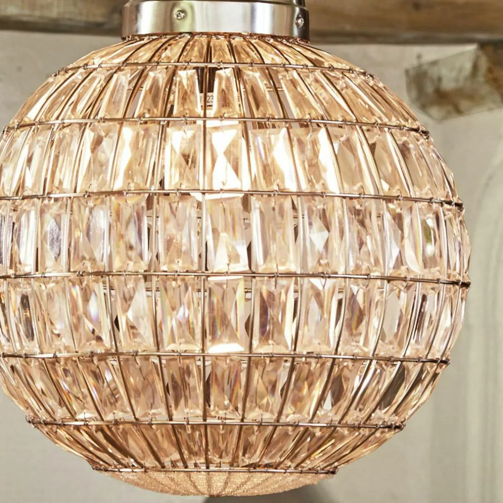 Glanz und Glamour besitzt eine ganz besondere Anziehungskraft. Das beweist auch diese außergewöhnliche runde Hängelampe, die an die stilistische Hochphase der Belle Époque erinnert. Ihr luxuriöses Design besteht aus längs- und quer verlaufenden Eisendrähten, die zwischen den zahllosen Glaskristallen angebracht sind. Sobald die Lampe eingeschaltet ist, wird der Glamoureffekt nochmal erhöht. Denn die rechteckig geschliffenen Gläser sorgen für einzigartige Lichtreflexe. Ein stilistisch wertvolles Unikat, prachtvoll und handwerklich perfekt. In verspielten Einrichtungen wie den Vintage-Chic oder Orient-Style fügt sie sich mühelos ein. In klarem modernem Interieur setzt sie einen reizvollen Kontrast. Ein Leuchtmittel ist im Lieferumfang nicht inbegriffen, so können Sie Ihre eigene Auswahl treffen.
