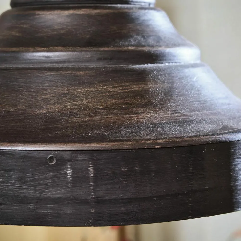 Ein Lichtobjekt, das Geschichten erzählt – diese Hängelampe bringt das Gefühl eines alten Landhauses direkt in Ihre vier Wände. Gefertigt aus massivem Mangoholz und komplett in ein antikschwarzes Finish getaucht, wirkt sie wie ein liebevoll bewahrtes Fundstück aus vergangenen Zeiten. Im Inneren befindet sich ein Antiksilber-Finish, was auch bei ausgeschaltetem Licht hübsch glänzt. Besonders der kunstvoll gedrechselte Abschluss verleiht ihr eine behagliche Ausstrahlung, wie man sie in charmanten Bauernküchen oder über großzügigen Esstischen auf dem Land findet. Das warme Licht bricht sich sanft an der dunklen Innenfläche des Schirms und schafft eine Atmosphäre voller Geborgenheit und Authentizität. Ob allein oder in Reihe über einem langen Tisch – diese Lampe schenkt jedem Raum eine unverwechselbare Note.