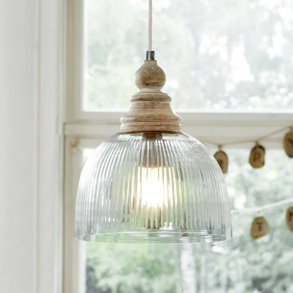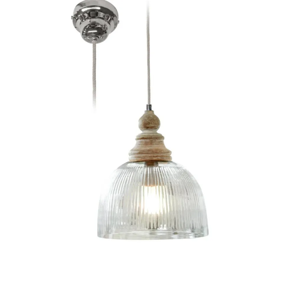 Schlichter und angenehm schnörkelloser Chic aus natürlichen Materialien: diese zauberhafte Lampe bringt viel Ruhe und Harmonie in jedes Ambiente. Besonders gut wirkt sie zum gemütlichen Landhaus-Stil. Ein formschöner Baldachin aus Mangoholz mit hübschem natürlichen Finish ziert den gläsernen Lampenschirm. Dieser weist einen feinen Rillenschliff auf, der sehr dekorativ wirkt. Ein ausgesprochen gelungener Material-Mix, der in wirklich jedes Ambiente passt. Damit werden lange, dunkel Wintertage strahlend hell. Die vollendete Harmonie des Designs ist einfach zeitlos schön.