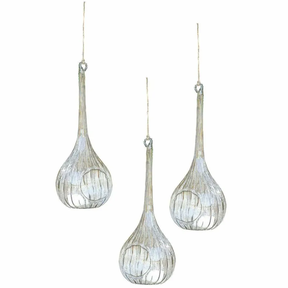 Diese filigranen und ganz zauberhaften Hängewindlichter bringen wundervolle Deko-Akzente in den Garten oder Ihr Heim. Sie sind aus fein mundgeblasenem Glas mit zarter Riffelung und haben eine Öffnung für Teelichter oder Dekoratives. Ein Bändchen zum Aufhängen aus natürlicher Jute ist schon dabei, und so können sie an einem Haken, Dachbalken oder in Zweigen im Garten ihren Charme spielen lassen. Genießen Sie eine reizende Beleuchtung sowie eine sehr liebevolle und leichte Dekoration im Trio, die wirklich zu jedem Ambiente eine Freude ist.