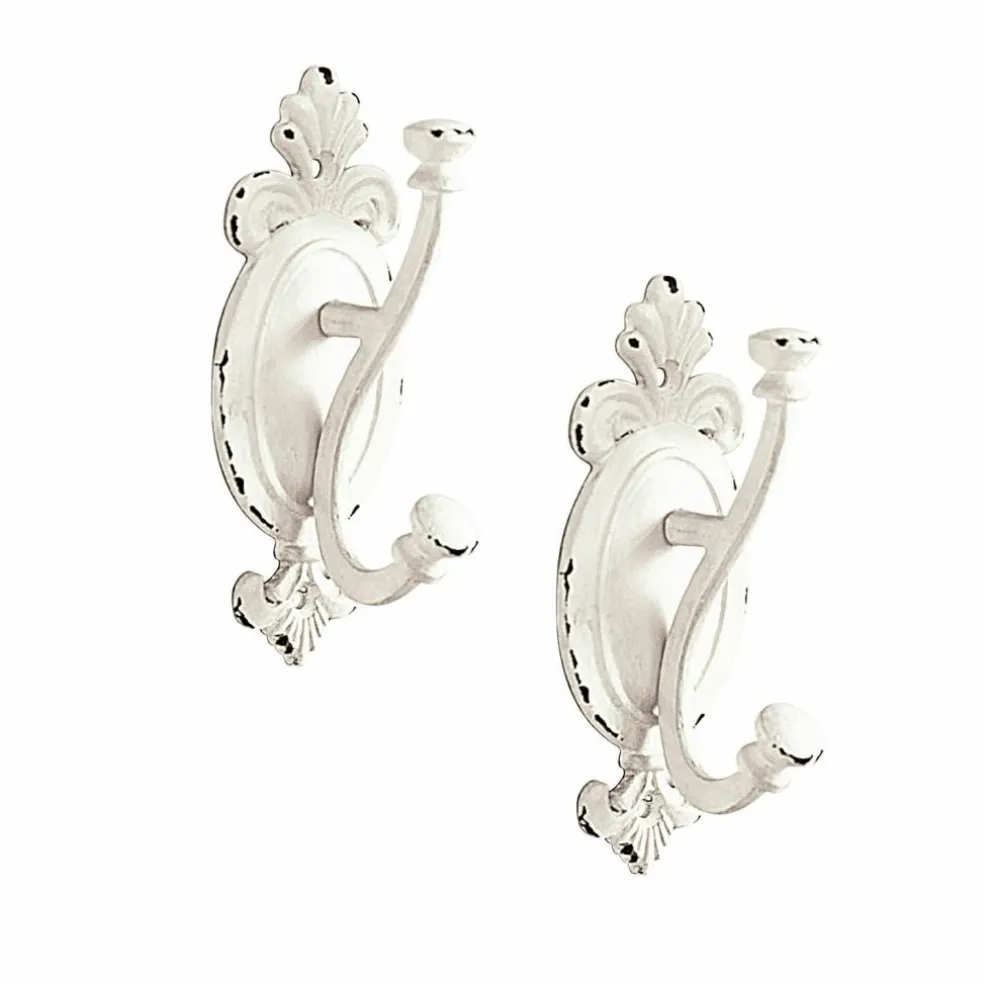Dieses nostalgische Haken-Duo im historischen Design verzaubert Ihr Zuhause: Es macht sich hervorragend in Flur, Bad oder Küche. Dort freuen sie sich auf Kleidungsstücke, Tücher oder Gegenstände aller Art. Die stabilen Eisenhaken sind mit einem faszinierenden Finish versehen, das die Antik-Optik unterstreicht. Die praktischen Helfer mit dem außergewöhnlichen Look passen dank ihres Designs perfekt zum Shabby Chic und französischen Landhaus-Stil.