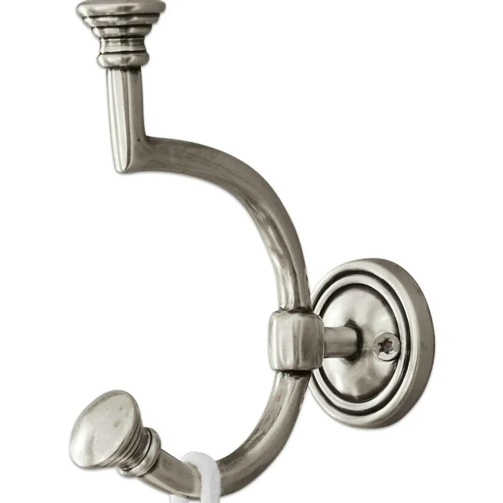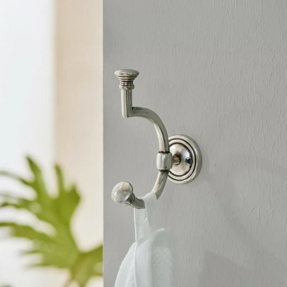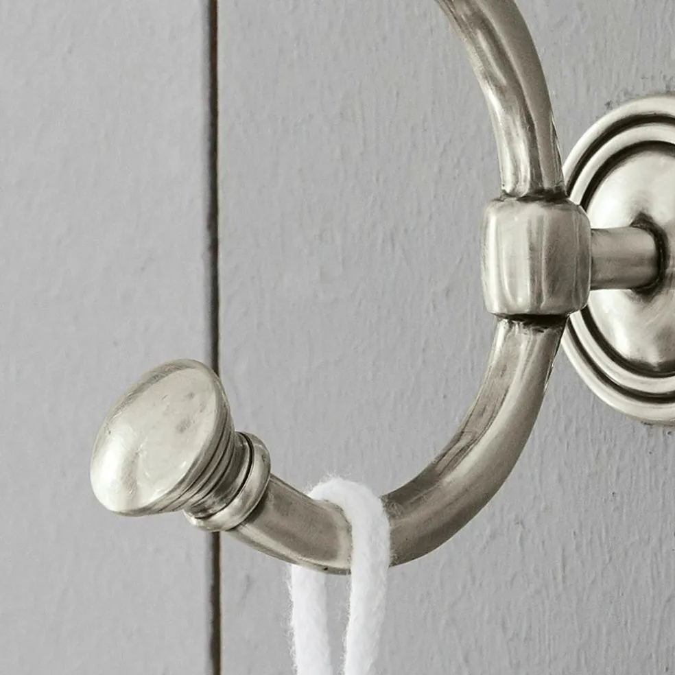 Ein stilvolles Accessoire aus vernickeltem Messing, das sich sehr vielfältig in Ihrem Zuhause nutzen lässt. Der historisch inspirierte Haken mit Vintage-Charme ist stabil und dekorativ. Er ist mit zwei Schrauben an der Wand zu befestigen. Verwenden Sie ihn in der Küche oder im Bad für Handtücher, im Flur für Schals und Hüte oder im Ankleidezimmer für Taschen und andere Accessoires. Das zeitlose Design macht zu jedem Stil eine gute Figur und ist ein vielseitiger Helfer für jeden Raum. Zu Shabby-Chic wie Landhaus-Stil ist er eine gute Wahl.