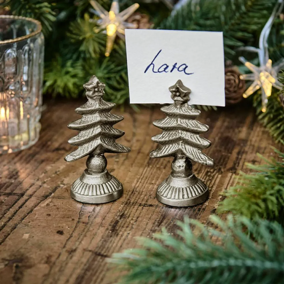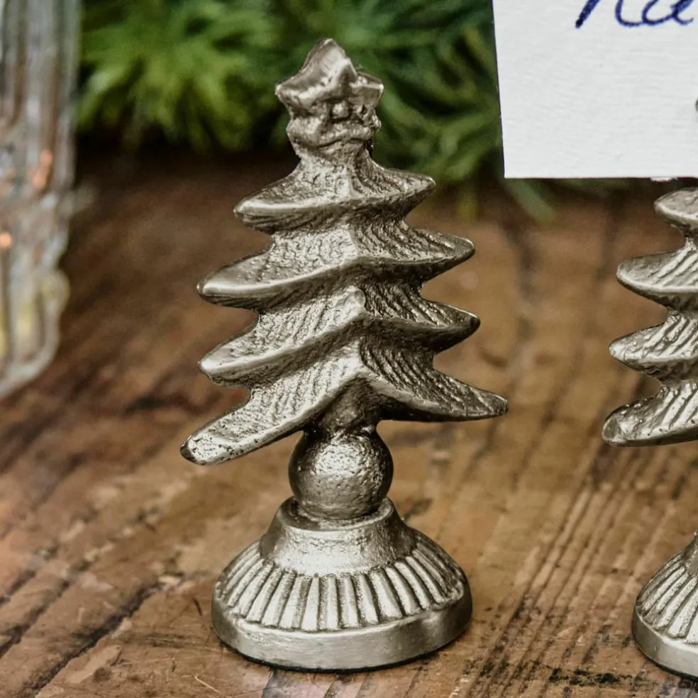 Wenn der Tisch gedeckt ist und Kerzenschein die Gläser zum Funkeln bringt, darf ein liebevolles Detail nicht fehlen: Diese beiden Kartenhalter im Tannenbaum-Design verleihen Ihrer Dekoration das gewisse Etwas. Gefertigt aus schwerem Aluguss und mit einem matten Antiksilber-Finish versehen, wirken sie wie kleine Skulpturen im Miniaturformat. Die Baumspitze ist so gestaltet, dass dort eine Karte sicher eingeklemmt werden kann – sei es mit einem Namen, einem Wunsch oder einem festlichen Gruß. Ein festliches Highlight für die Weihnachtstafel, das garantiert ins Auge fällt.