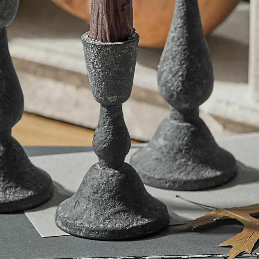 Mit diesem dreiteiligen Kerzenhalter-Set zieht ein Hauch von rauer Poesie in Ihr Zuhause ein. Gefertigt aus Eisen und veredelt mit einer antikgrauen Oberfläche, bringen die Kerzenhalter eine besondere Tiefe ins Spiel – durch ihre leicht unregelmäßige Textur, die an verwittertes Gestein erinnert, und die individuell gestalteten Formen, die sich perfekt ergänzen. Ob als Ensemble auf dem Esstisch, einzeln auf Sideboards oder kombiniert mit Naturmaterialien auf einer festlichen Tafel – diese Kerzenhalter schaffen eine warme Lichtstimmung mit kraftvoller Ausdruckskraft. Ein Set, das durch Schlichtheit und Präsenz gleichermaßen beeindruckt.