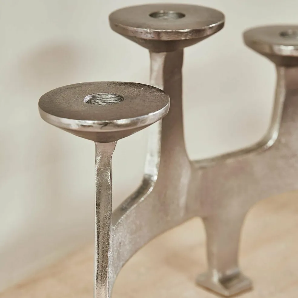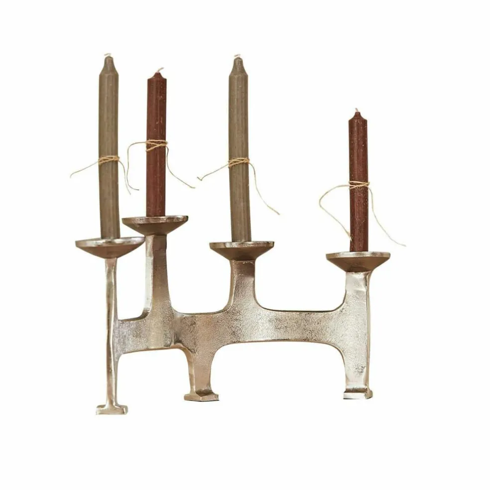 Nicht einfach ein Kerzenständer – sondern ein ausdrucksstarkes Designobjekt. Die vier erhöhten Halterungen scheinen aus dem silberfarbenen Aluminiumkörper zu wachsen wie aus einem einzigen Guss. Dabei entsteht eine wellenartige Silhouette, die Bewegung und Ruhe zugleich ausstrahlt. Die Oberfläche im Antiksilber-Look zeigt feine Strukturen und changierende Nuancen, die je nach Lichteinfall unterschiedlich wirken. Ob auf dem Esstisch, Sideboard oder Fensterbrett – dieser Kerzenhalter zieht die Blicke auf sich und bringt formschöne Klarheit in jeden Raum.