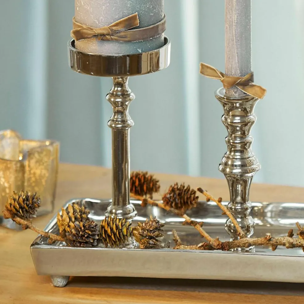 Erleben Sie die perfekte Kombination aus Stil und Funktionalität mit unserem exquisiten Kerzentablett. Die hochglänzend polierte Oberfläche reflektiert das Licht und verleiht jedem Raum einen Hauch von Luxus. Das Tablett ist ideal für Stab- und Stumpenkerzen, die nicht im Lieferumfang enthalten sind, und bietet zusätzlich Platz für saisonale Dekorationen, sodass Sie es individuell gestalten können. Die elegante Form und das raffinierte Design machen dieses Kerzentablett zu einem unverzichtbaren Highlight auf Ihrem Tisch oder Sideboard. Genießen Sie die warme, einladende Atmosphäre, die dieses hochwertige Dekorationsstück in Ihr Zuhause bringt.