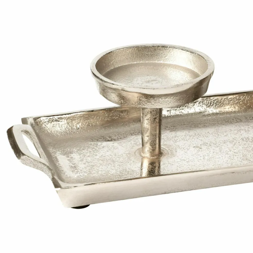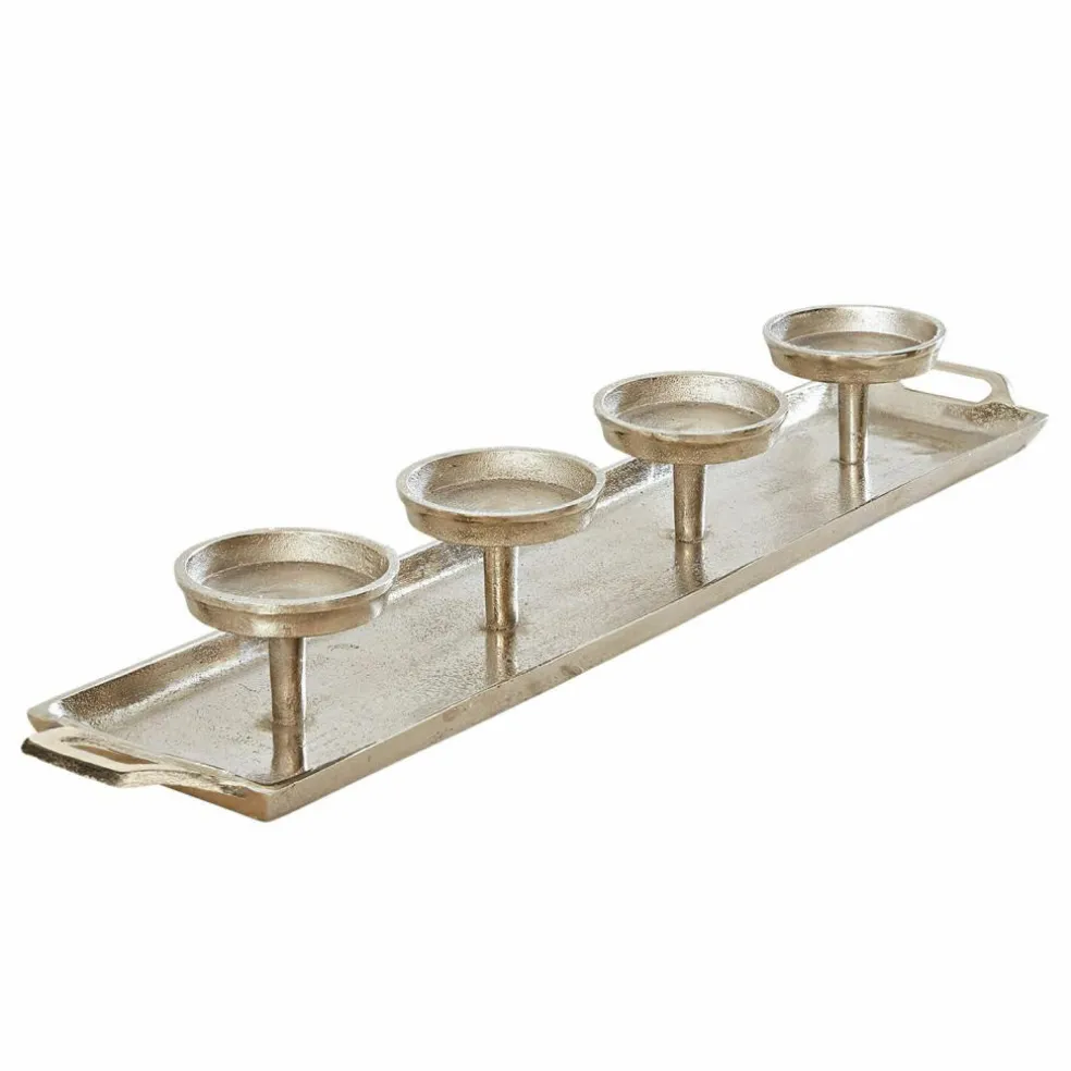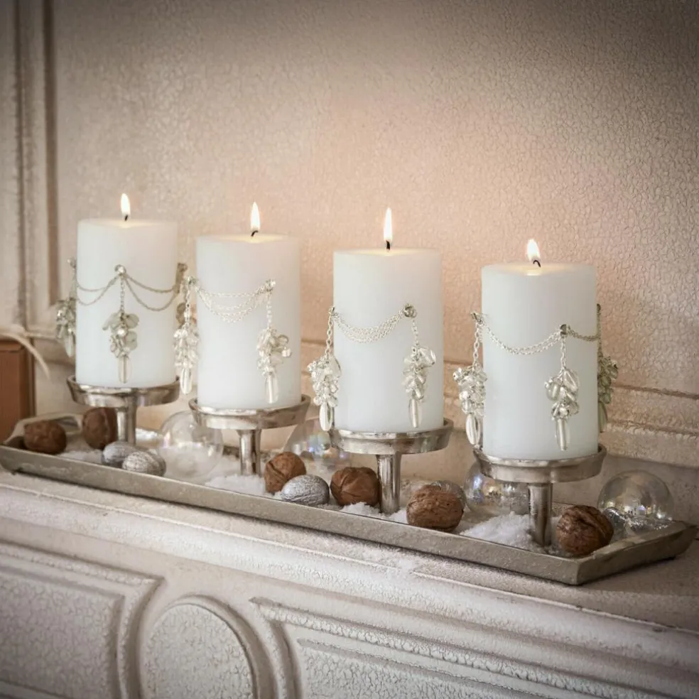 Ganz egal, ob Sie dieses wunderschöne Kerzentablett auf dem Esstisch, einer Kommode oder auf dem Fenstersims anrichten – es sorgt garantiert für eine wohlige Stimmung. Vier großzügig dimensionierte Kerzenteller sind darauf angebracht, sodass nicht nur Teelichter, sondern auch große Stumpenkerzen darauf Platz finden. Das zeitlose Design überzeugt mit einem silbrigen Schimmer, der die elegante Note des Kerzentabletts unterstreicht. Es passt es zu fast allen Einrichtungsstilen und kann auch mit Accessoires in kräftigen Farben kombiniert werden. Dieses einzigartige Design vereint auf elegante Art und Weise ein praktisches Tablett mit einem hübschen Kerzenhalter. So kann auf dem Tablett zusätzlich noch allerhand Deko hübsch arrangiert werden – je nach Jahreszeit.