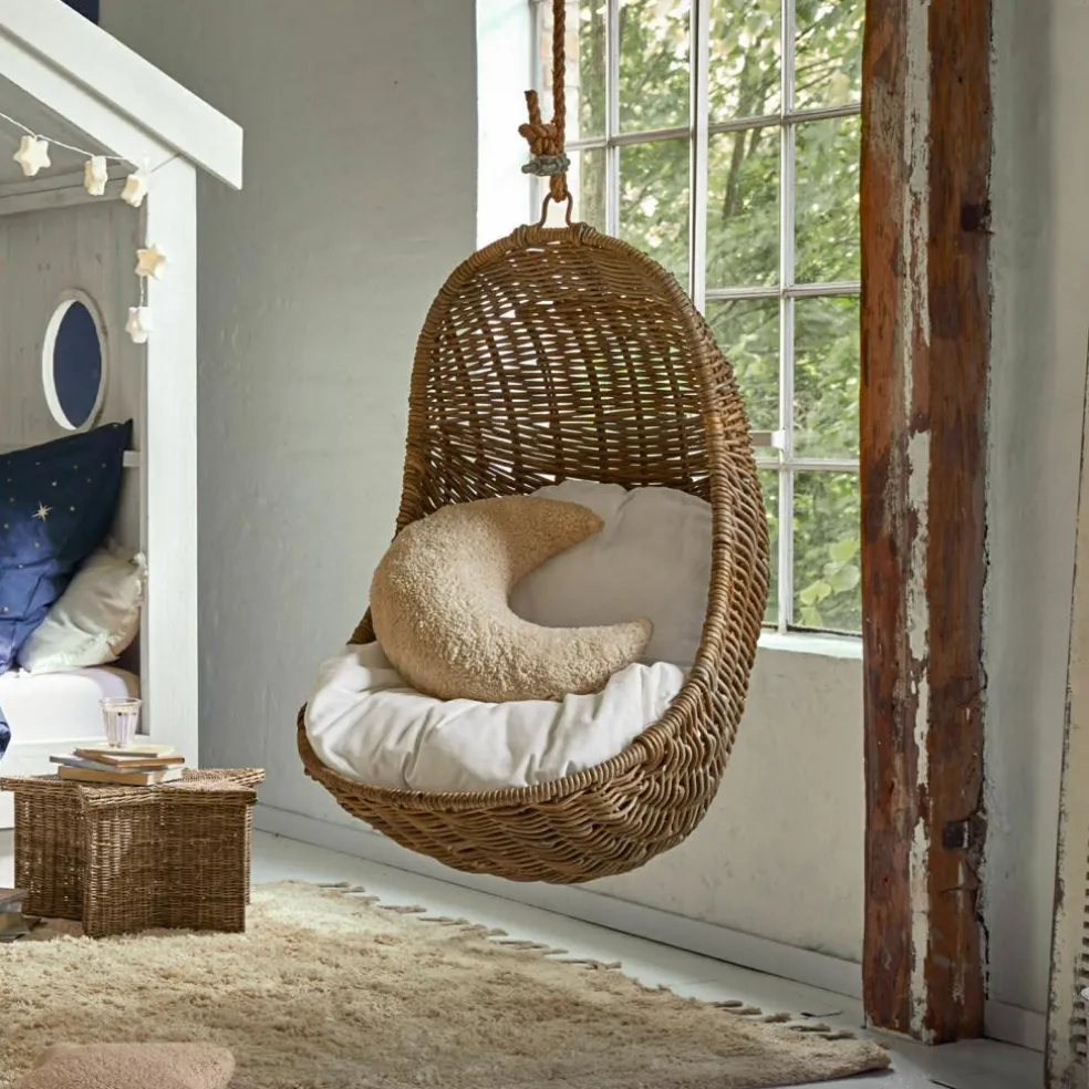 Wie eine kleine Hütte in der Luft lädt dieser Kinderhängesessel zum Kuscheln, Lesen und Träumen ein. Seine organische Form schmiegt sich sanft um den Körper, das handgeflochtene Rattan fühlt sich angenehm an und lässt Licht und Luft hindurchspielen. Im Inneren sorgt ein robustes Eisengestell für sicheren Halt, während ein weiches Polsterkissen zum Verweilen verführt. An einem Juteseil befestigt, wird aus dem Sessel ein schwebender Rückzugsort, der Natürlichkeit und Geborgenheit ausstrahlt. Ideal für kleine Abenteurer, die zwischendurch in ihrer eigenen Wolke ruhen möchten.