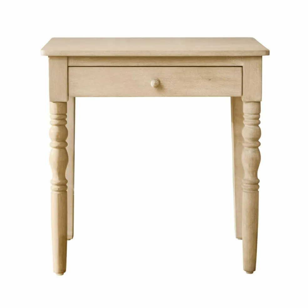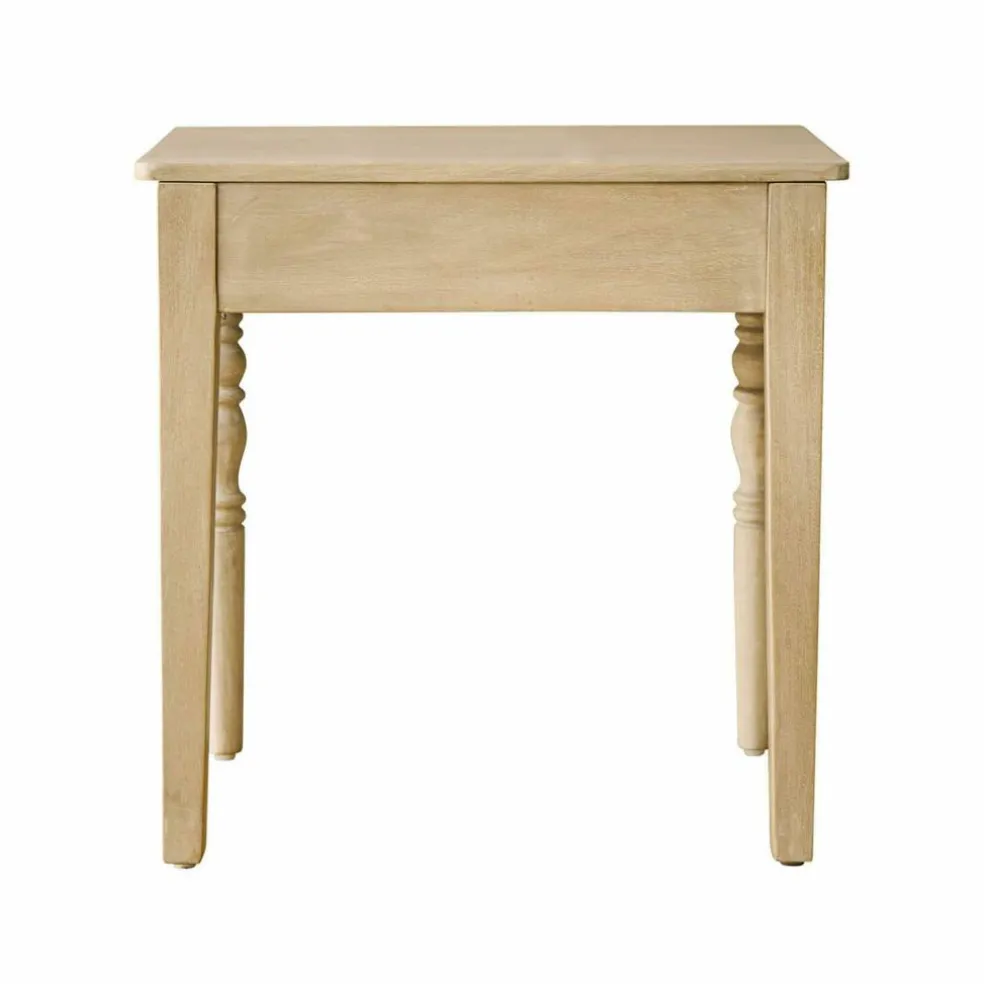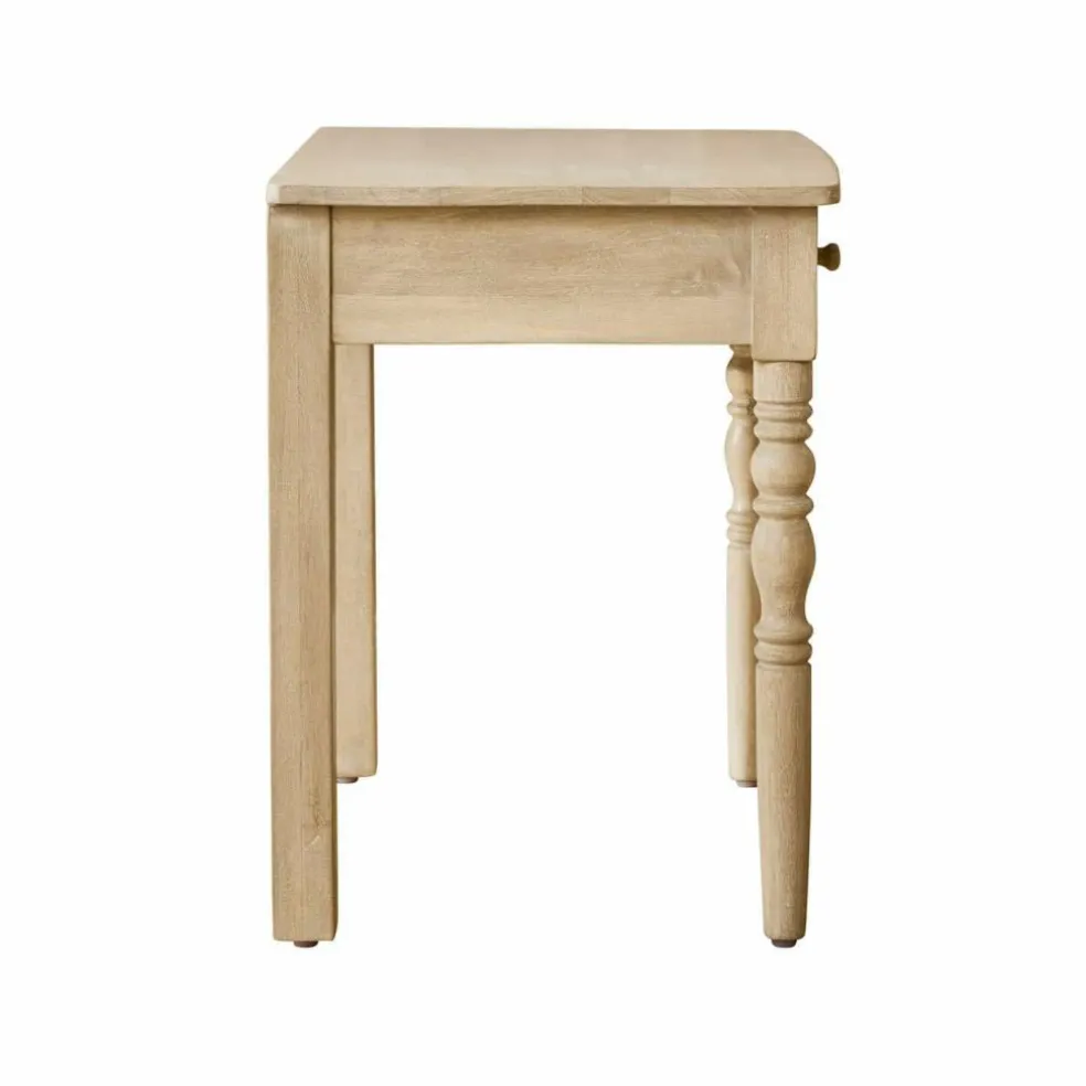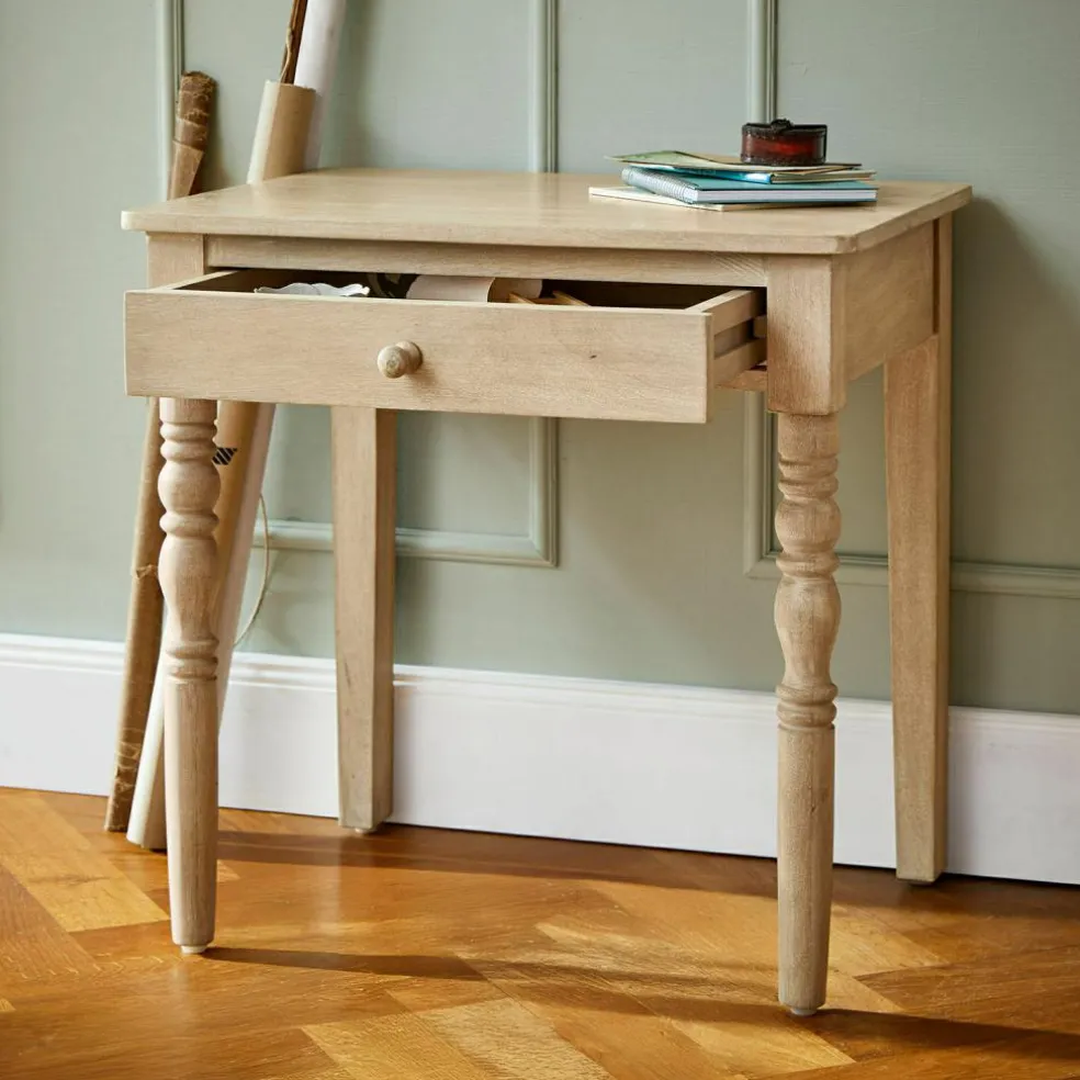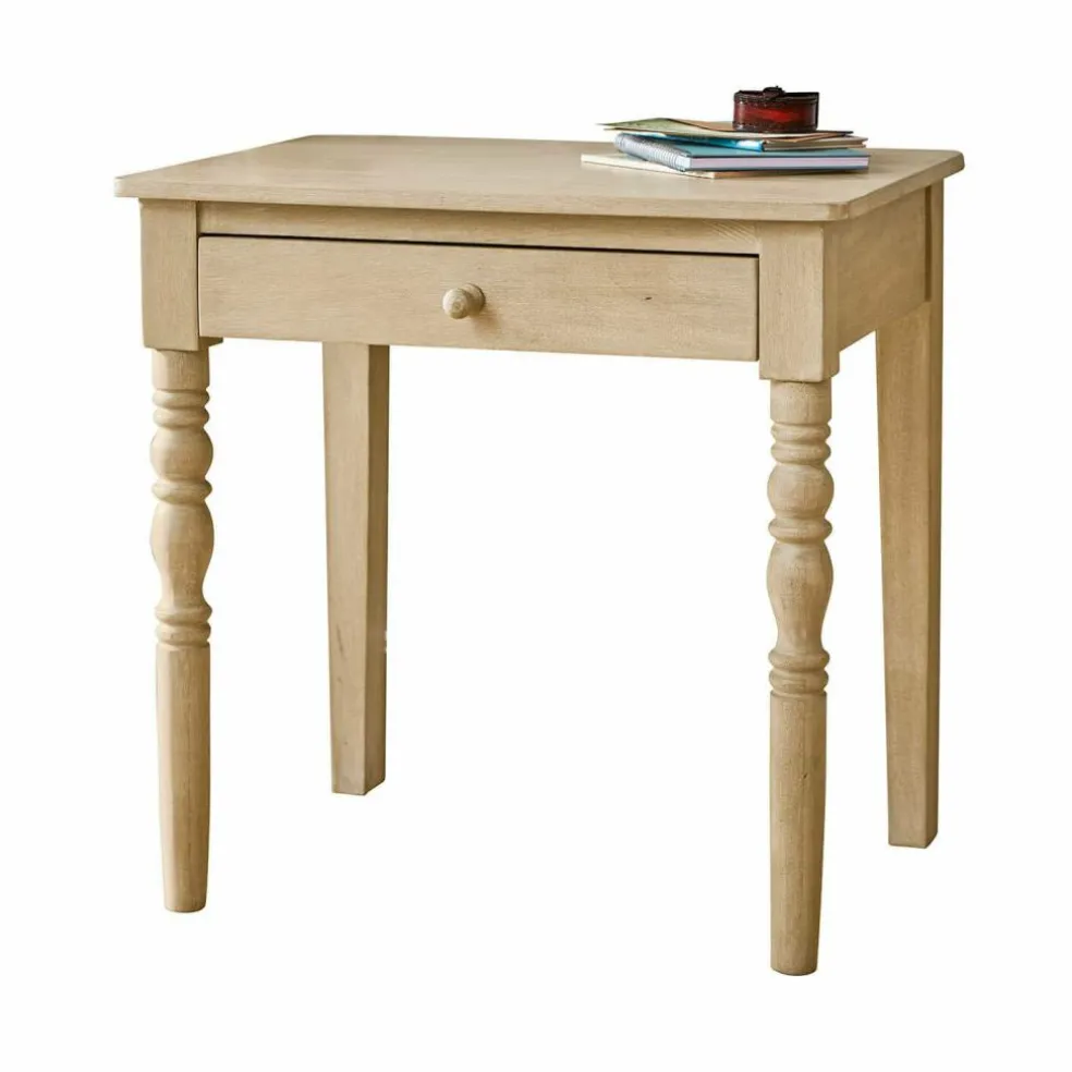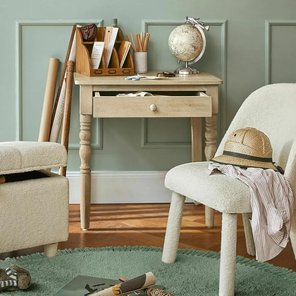 Dieser Kinderschreibtisch vereint Funktionalität und Design auf eindrucksvolle Weise. Aus hochwertigem Mangoholz gefertigt und mit einem zarten Antikgrau-Finish versehen, bringt er einen Hauch von Vintage-Flair in jeden Raum. Die liebevoll gedrechselten Beine zeugen von klassischer Handwerkskunst und verleihen dem Möbelstück eine stilvolle Optik. Eine geräumige Schublade bietet Platz für alle wichtigen Utensilien, sei es für kreative Bastelstunden oder die ersten Hausaufgaben. Ideal für das Kinderzimmer, fügt sich der Schreibtisch dank seines schlichten und dennoch ausdrucksstarken Designs harmonisch in verschiedenste Einrichtungsstile ein.