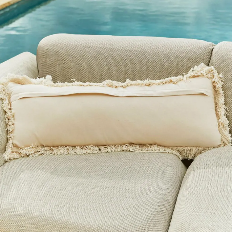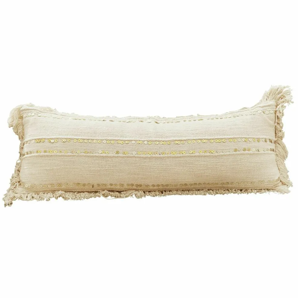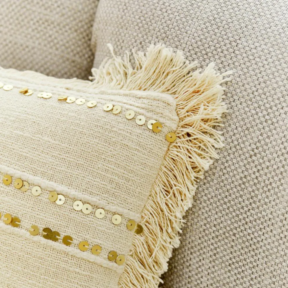 Ein Kissen, das durch sein raffiniertes Webmuster und seine edlen Details besticht. Die aus Baumwolle gewebte Struktur verleiht dem Kissen eine besondere Tiefe und eine angenehme Haptik. Die funkelnden Pailletten setzen einen charmanten Glanzpunkt, während die Fransen das Gesamtbild harmonisch abrunden. Diese Kombination aus Struktur und Dekor macht das Kissen zu einem stilvollen Accessoire für Ihr Wohnzimmer oder Schlafzimmer. Ob auf dem Sofa, dem Bett oder als dekorativer Akzent auf einem Sessel – dieses Kissen bringt eine exklusive Note in jede Einrichtung. Dank des weichen Innenkissens ist es sofort bereit für den Einsatz.