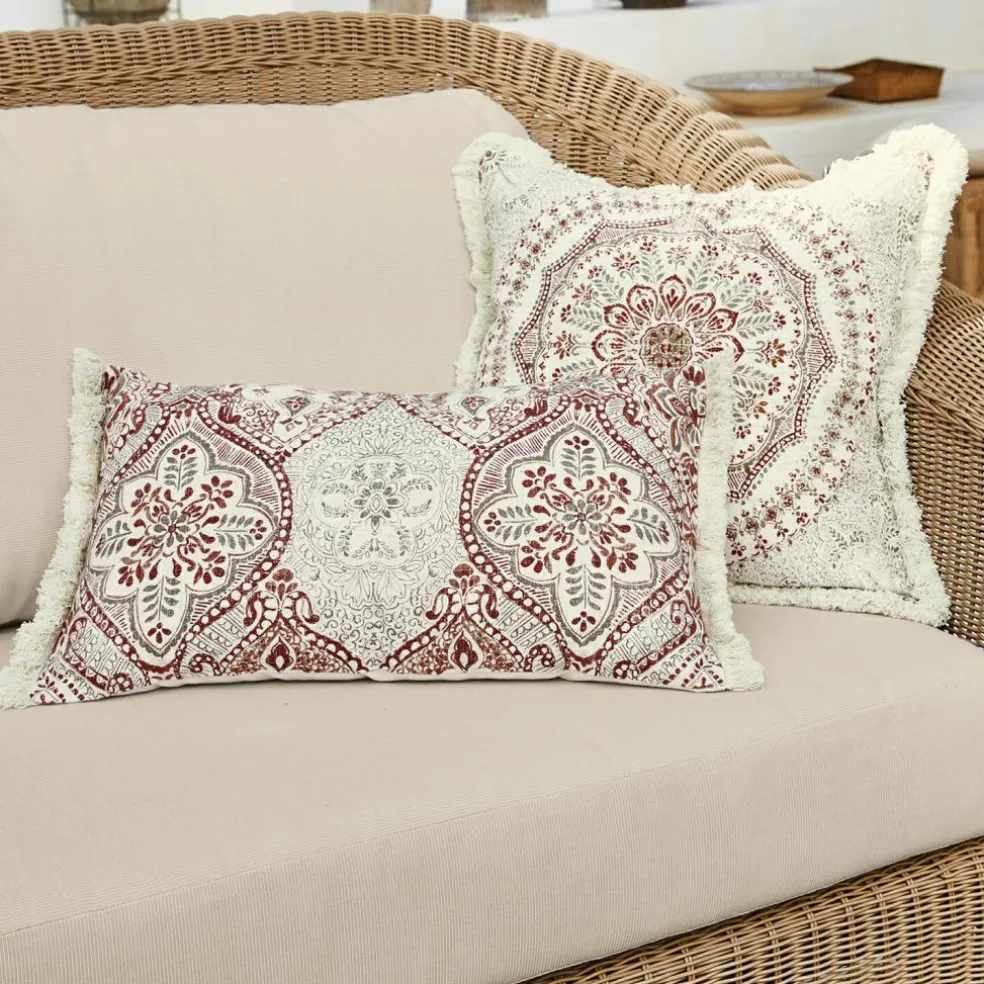 Florale Motive, abstrakte Ornamente, üppige Arabesken – mit orientalischen Designs zieht der Zauber des Orients bei Ihnen ein. Vielleicht erinnern Sie die Muster an Reisen in ferne Länder, vielleicht genießen Sie aber auch einfach nur den dekorativen Effekt. Bei dieser Kissenhülle im 2er Set wurden die Muster besonders detailreich ausgeführt und wirken mit ihrer strengen Symmetrie wie Mandalas, die mit einem Stift kunstvoll ausgemalt wurden. In diesem Fall sind die grazilen, gestochen scharfen Details das Ergebnis eines hochwertigen Digitalprints, und zwar auf weißem Untergrund, der die zart grauen wie auch die kräftig roten Farbtöne perfekt zur Wirkung bringt. Das Gewebe und der rundum laufende Fransenabschluss bestehen aus feiner, reiner Baumwolle, die Sie mit ihrer hautfreundlichen Haptik verwöhnen wird. Die Rückseite jeder Kissenhülle ist unifarben weiß und mit einem Reißverschluss versehen, so dass Sie im Falle eines Falles die Kissenhülle abziehen und waschen können.