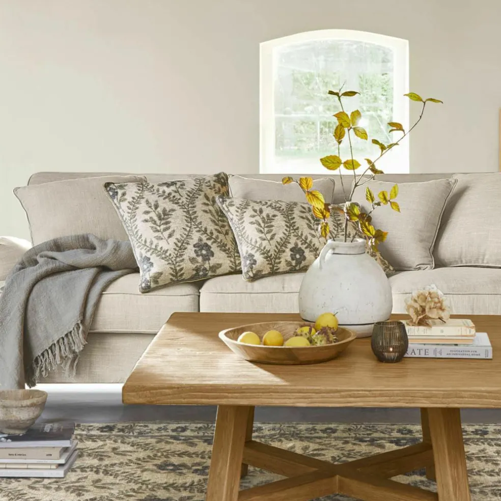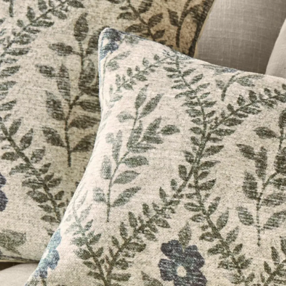 Wenn feine Blättermuster und gedeckte Blütenfarben auf strukturierten Stoff treffen, entsteht ein Wohntextil mit besonderem Charakter. Dieses zweiteilige Set verbindet zwei unterschiedliche, aber aufeinander abgestimmte Designs – mal in verspielter Rankenform, mal grafischer angeordnet. Die sanfte Farbgebung in Moosgrün, Nachtblau und Naturweiß lässt sich wunderbar kombinieren, sei es mit Leinen, Holz oder gedeckten Erdtönen. Dank des gewebten Materials fühlen sich die Kissen nicht nur angenehm an, sondern zeigen auch aus der Nähe ihre textile Tiefe. Ein Duo, das dem Raum eine ruhige, wohnliche Note schenkt – wie ein Hauch von Gartenidylle im Interieur.