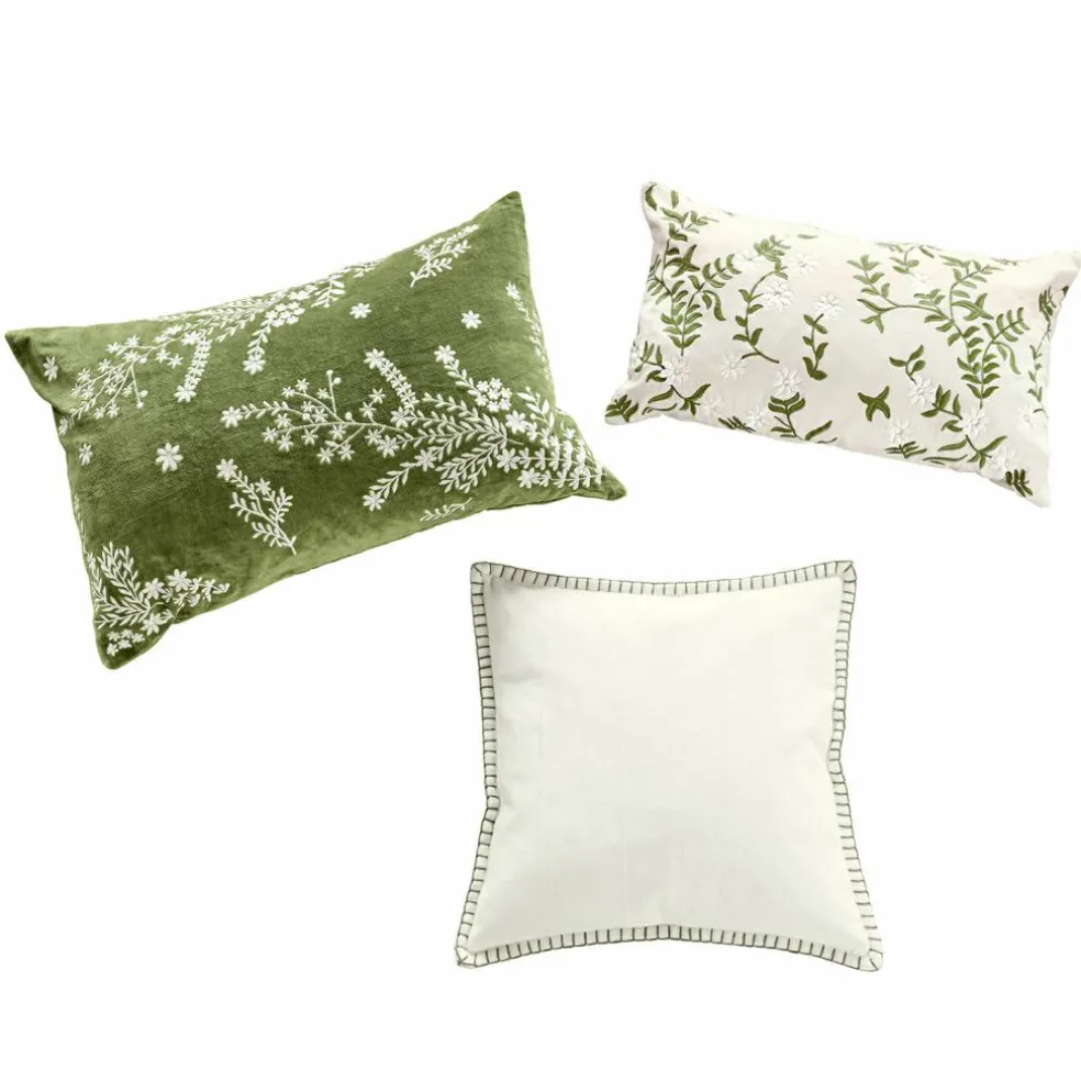 Diese Kissenhüllen präsentieren sich in natürlich schönen Grün-Creme-Tönen und entfalten ein entspannt sommerliches Flair im Raum, auch wenn draußen graue Regenwolken über den Himmel jagen. Zwei Kissenhüllen sind liebevoll mit zierlichen Ranken und Blüten bestickt, die dritte im Bunde begnügt sich mit einem schlichten Festonstich an den Außenkanten. Ein Kissen-Trio, das wunderbar aufeinander eingespielt ist und am liebsten als Gruppe auftritt. Doch das reizvolle Kissenhüllen 3er Set beschränkt sich nicht auf die dekorative Rolle, sondern verwöhnt Sie auch mit seiner kuschelweichen Haptik, denn als Stoff wurde hautfreundlicher Baumwollsamt gewählt. Natürlich können Sie jede Kissenhülle in der Maschine waschen, ein verdeckter Reißverschluss auf der Rückseite erleichtert das Abziehen.
