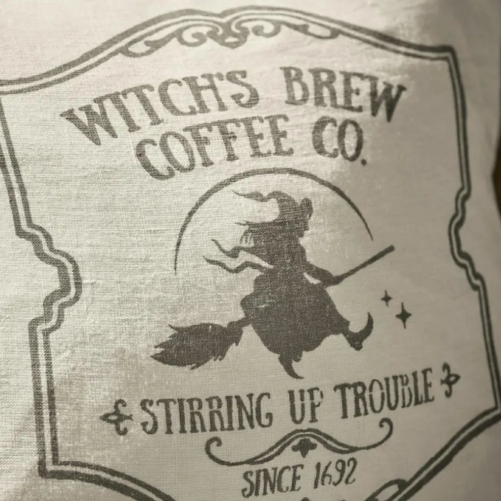 Ein Hauch von Magie, ein Augenzwinkern und ganz viel Charakter: Diese Kissenhülle aus 100 % Leinen spielt mit Vintage-Ästhetik und Humor. Der schwarze Druck auf naturweißem Untergrund erinnert an alte Reklametafeln und lässt sofort ein warmes Café-Gefühl entstehen – natürlich mit einem kleinen Hexenschuss an Witz. Der Stoff ist grob gewebt und strahlt eine angenehm rustikale Authentizität aus. Ob zu Halloween oder einfach als origineller Hingucker im Alltag – dieses Textil bringt charmant Unruhe ins Spiel, ganz nach dem Motto: „Stirring up trouble since 1692“.