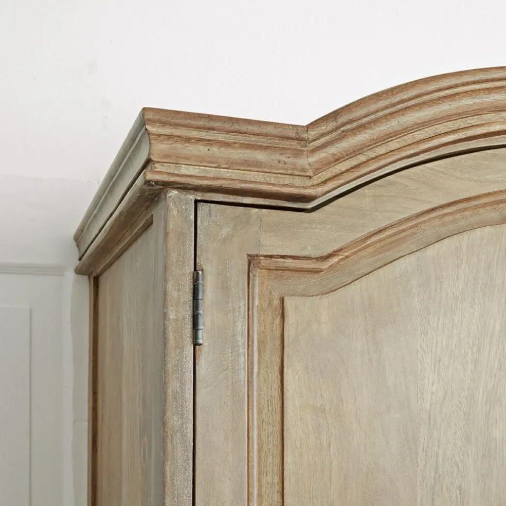 Möchten Sie ablegen? Allein diese Frage zeigt, dass hier gesellschaftliche Umgangsformen gepflegt werden, die nicht mehr selbstverständlich sind. Und wenn dann der Gast sieht, wie Sie seine Jacke ordentlich auf einem Bügel in einer Garderobe wie dieser verstauen, wird er sich gleich noch mehr willkommen fühlen. Sicher wird sein Blick zu dem aufwendig gearbeiteten Kranz der Garderobe wandern, dann über die schöne Holzoberfläche mit dem Antik-Touch und anderen Details gleiten, um schließlich bei den zierlich gearbeiteten Füßen zu enden. Ja, diese Garderobe ist erkennbar ein Qualitätsmöbel aus der Hand eines Fachmanns, der mit Liebe zu dem Werkstoff Holz und mit einem Faible für hübsche Details ans Werk geht. Hinter den beiden Türen des oberen Garderobenteils, die mit einem praktischen Magnetverschluss ausgestattet sind, befindet sich eine stabile Kleiderstange. Im unteren Teil warten zwei geräumige Schubladen darauf, Schals, Mützen und Handschuhe, die Hundeleine, Einkaufsbeutel oder was Sie sonst gerne im Eingangsbereich griffbereit haben, in Empfang zu nehmen. Oder suchen Sie einen stilvollen Platz für die Hausschuhe der Familie wie für Gäste? Bitte sehr, eine der Schubladen widmet sich gerne dieser Aufgabe. Um den authentischen Look perfekt zu machen, tragen die Türen runde Knäufe, die Schubladen klassische Ringe.