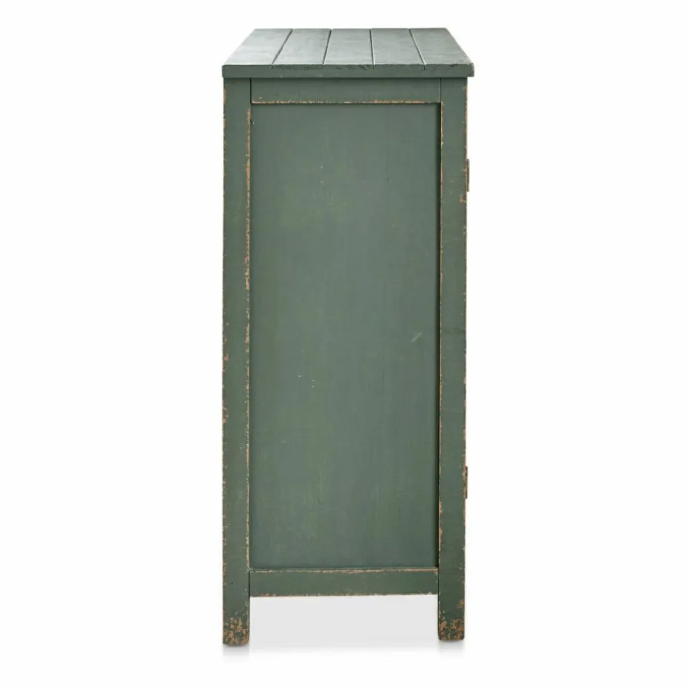 Ein bisschen Vintage-Flair verleiht Möbeln den individuellen Charakter, den wir in der heutigen Zeit so schätzen. Möbel, die nicht vom Fließband kommen, sondern in einer Tischlerwerkstatt sorgfältig von Hand gefertigt werden, die in unserem Wohnambiente einen Hauch Nostalgie verbreiten, ohne altmodisch zu wirken. Deshalb sollten Sie dieser Kommode einen besonders schönen Platz geben, an dem sie ihren Charme spielen lassen kann. Denn nicht nur der Korpus der Kommode wurde nach allen Regeln der Handwerkskunst gebaut, der Tischler hat sich auch mit dem Finish besonders viel Mühe gegeben. Die liebevoll angebrachten Gebrauchsspuren lassen vermuten, wie beliebt die Kommode früher war und dass wahrscheinlich schon mehr als eine Generation darin die verschiedensten Utensilien verstaute. Bücher oder Geschirr, Deko-Objekte, Vasen, Kerzen und Co werden in den zwei Fächern hinter den Glastüren einen stilvollen Platz finden. Interessant ist auch der grüne Farbton der Kommode, der sich bei Möbeln eher selten findet, der aber einen naturnahen Akzent im Raum setzt, den Sie mit Grünpflanzen und anderen grünen Deko-Objekten noch unterstreichen können.
