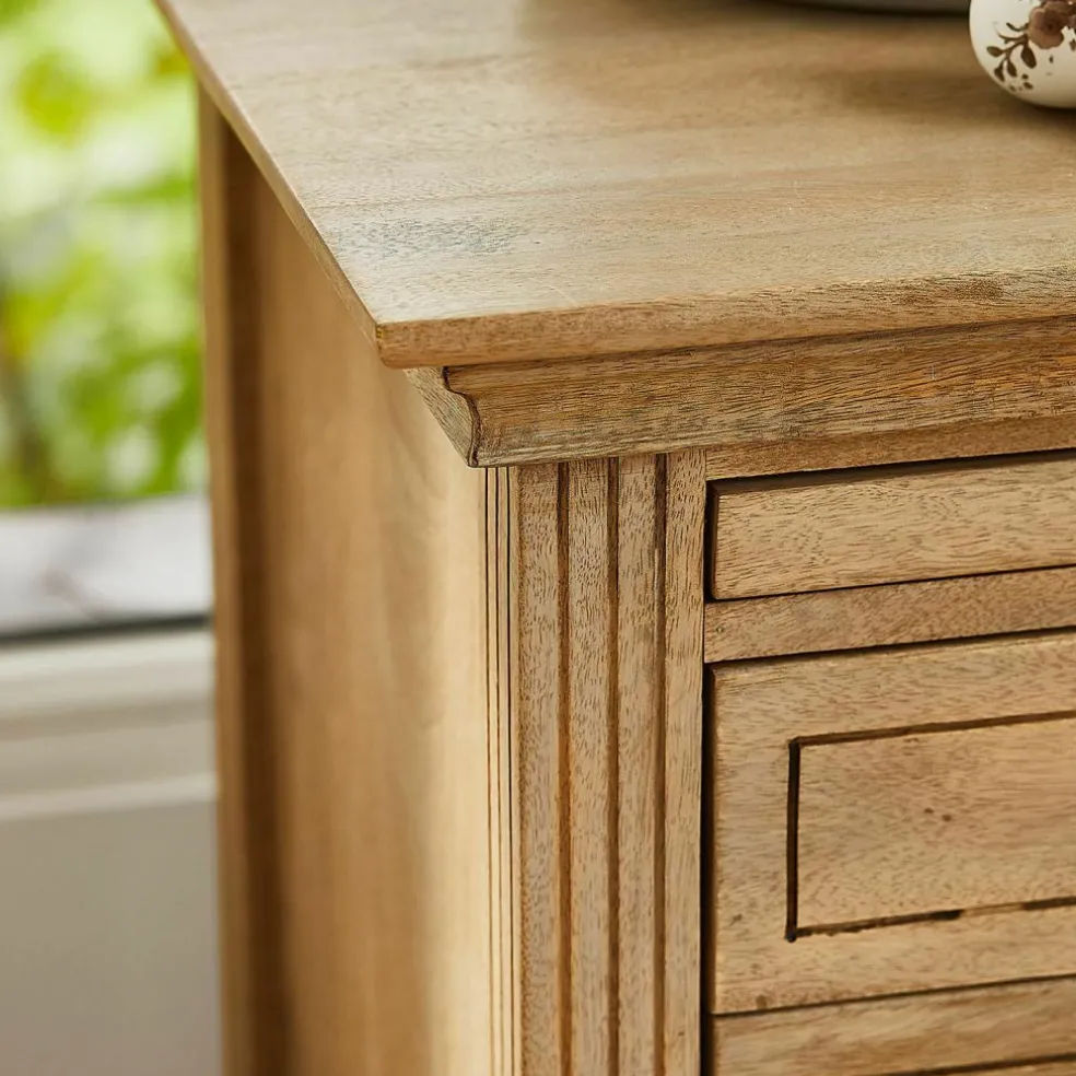 Verleihen Sie Ihrem Zuhause einen Hauch von rustikalem Charme mit dieser beeindruckenden Kommode aus massivem Mangoholz. Das dezente antikgraue Washed-Finish und die sichtbaren Holzmaserungen machen jedes Stück zu einem einzigartigen Kunstwerk der Natur. Die sorgfältig gearbeiteten Schubladen bieten reichlich Stauraum für Ihre Habseligkeiten, während die oberen beiden Auszüge eine praktische Besonderheit darstellen: Sie können als zusätzliche Ablagefläche genutzt werden oder bieten Platz für ein bequemes Schreibpult. Dieses vielseitige Möbelstück ist nicht nur funktional, sondern auch ein stilvolles Statement in jedem Raum. Ob im Wohnzimmer zur Aufbewahrung von Büchern und Dekorationen, im Schlafzimmer für Kleidung und Accessoires oder im Arbeitszimmer als stilvolle Organisationseinheit – diese Kommode fügt sich harmonisch in jede Einrichtung ein und bereichert Ihr Zuhause mit natürlicher Schönheit und praktischer Raffinesse.