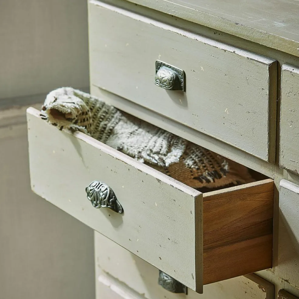 Die Kommode vereint nostalgisches Design mit praktischem Stauraum in einer charmanten Mischung. Ihr Antikgrün-Finish verleiht ihr eine sanfte, leicht verwitterte Optik, die den Charme eines Landhauses in Ihr Zuhause bringt. Die zwölf Schubladen bieten ausreichend Platz für Kleidung, Accessoires oder Haushaltsgegenstände, während die kunstvoll gestalteten Griffe in zwei unterschiedlichen Designs für einen besonderen Akzent sorgen. Ob im Schlafzimmer als Aufbewahrungslösung für Wäsche oder im Wohnzimmer als dekorativer Blickfang – diese Kommode wird zum Herzstück jedes Raumes und verleiht ihm einen Hauch von Geschichte.