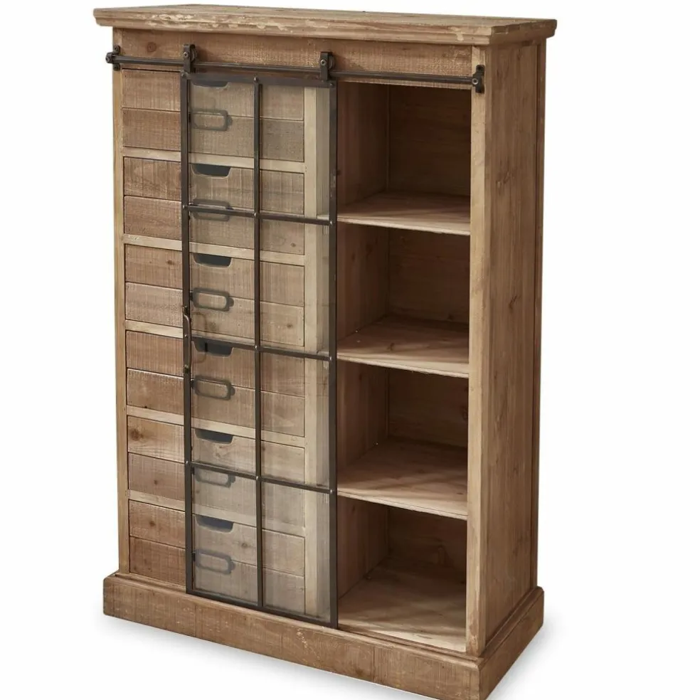 Ein Schmuckstück mit viel Retro-Charme, das an die Aktenschränke vergangener Jahrhunderte erinnert. Hier finden Unterlagen, aber auch künstlerische Accessoires wie Papier und Pinsel und viele weitere Dinge jede Menge Platz. In sechs Schubladen und vier Fächern mit drei Einlegeböden lässt sich alles Mögliche wunderbar ordentlich verstauen. Hinter der Schiebetür aus Glas und Eisen kommen dekorative Accessoires besonders gut zur Geltung. Das massive Modell besteht aus nachhaltig wiederaufbereitetem Tannenholz und Kiefernholz. Die Oberfläche ziert ein dezentes Antik-Finish, wodurch die Maserung des Holzes sichbar bleibt. Die feinen Metallbeschläge der Schubladen wirken angenehm nostalgisch. Ein stabiles und sehr solides Möbelstück mit viel Stauraum und zeitlos klassischem Chic, das Sie lange begleiten wird.