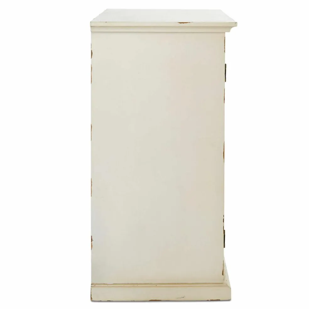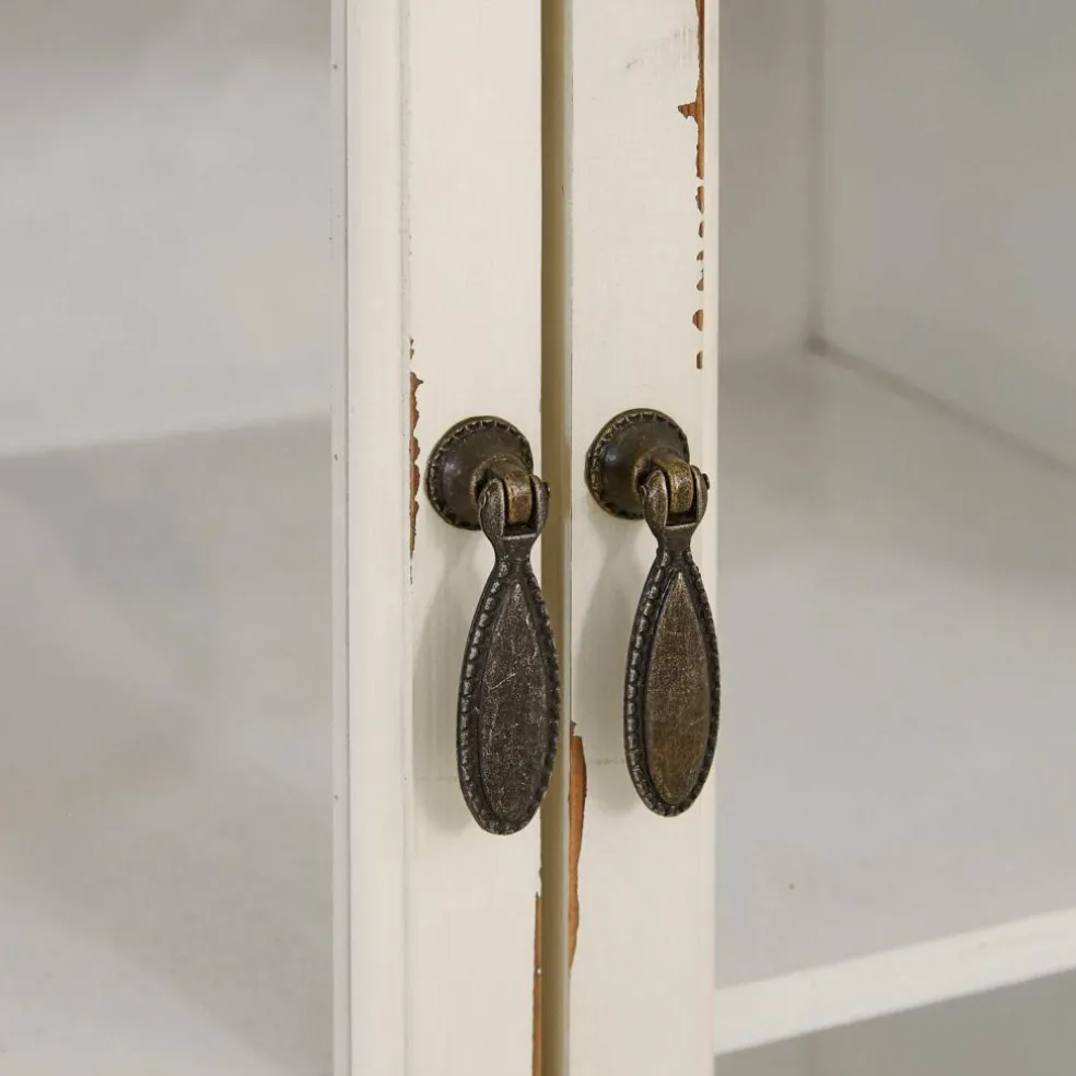 Was fasziniert uns eigentlich so an dem Einrichtungstrend, der als Shabby-Chic immer mehr Liebhaber findet? Ist es die Vorstellung, dass die Möbel mit den sichtbaren Gebrauchspuren einen ganz eigenen Charakter haben und uns Geschichten aus vergangenen Zeiten erzählen? Oder dass wir an den kleinen, aber feinen Details erkennen, dass das Möbelstück mit Sorgfalt in bester Handwerksmanier von Hand gefertigt wurde? Wenn diese Kommode vielleicht bald in Ihren vier Wänden steht und Sie auf den stabilen Regalböden hinter den Glastüren Sammlerstücke wie das Kaffeegeschirr der Großmutter oder andere geliebte Deko-Objekte arrangieren, werden auch Sie die nostalgische Ausstrahlung dieser Kommode spüren. Von den geschwungenen Glastüren mit den kunstvoll verzierten Eisengriffen bis zu dem stabilen Podest ist die Kommode ein Schmuckstück, das in jedem Raum einen Hauch Romantik verbreiten wird. Aber nicht nur die dezenten Gebrauchsspuren an den Türen der Vitrine und an den anderen Holzelementen, sondern auch der antike Farbton selbst trägt zum nostalgischen Flair der Kommode bei.