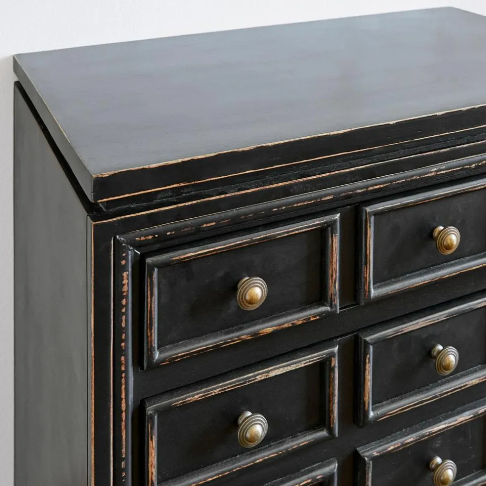 Ein wahres Schmuckstück für jedes Zuhause. Das Design, welches die Illusion von 15 kleinen Schubladen erzeugt, bietet tatsächlich drei großzügige Schubladen für all Ihre Aufbewahrungsbedürfnisse. Die handgefertigte und handbemalte Oberfläche verleiht ihr einen unverwechselbaren Shabby-Look, der durch ein deutliches Antik-Finish abgerundet wird. Jeder Pinselstrich und jede Kante erzählt eine Geschichte, und die schwarze, abgenutzte Oberfläche verleiht dem Möbelstück eine zeitlose Eleganz und einen Hauch von Nostalgie.