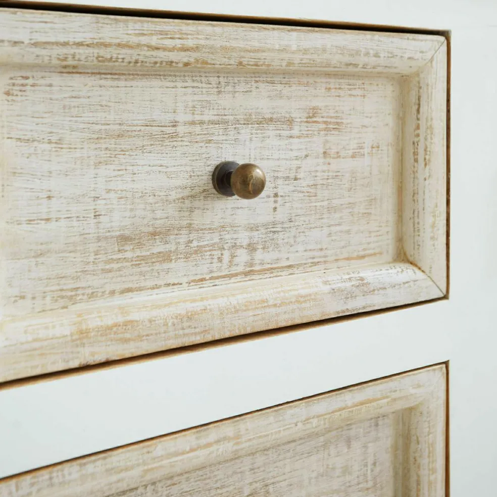 Diese Kommode bringt den authentischen Charme des Landhaus-Stils direkt in Ihr Zuhause. Aus massivem Mangoholz gefertigt, besticht sie durch ihre langlebige Qualität und die weiß gekalkte Oberfläche, die einen Hauch von Vintage-Flair verleiht. Die charakteristischen Lamellentüren mit ihrem originellen, praktischen Verschluss fallen sofort ins Auge und bieten zusammen mit den drei geräumigen Schubladen ausreichend Stauraum für Ihre Alltagsgegenstände. Ob im Wohnzimmer, Flur oder Schlafzimmer – dieses Möbelstück verleiht jedem Raum eine gemütliche und einladende Atmosphäre. Die Kombination aus rustikaler Ästhetik und praktischer Funktion macht diese Kommode zu einem unverzichtbaren Begleiter im Landhaus-Stil.