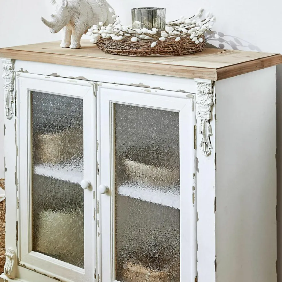 Möbel mit Vintage-Flair öffnen uns den Blick in die Vergangenheit. Wir sehen, wie diese Kommode vielleicht in einem großen Landhaus steht und eine elegant gekleidete Dame die Türen der Kommode öffnet, um etwas hineinzulegen oder herauszunehmen. Oder schauen Sie in die Schreinerwerkstatt und beobachten, wie der Handwerker die Kommode ganz traditionell von Hand baut und verziert, bis er zum Schluss den Korpus antikweiß lackiert? Lassen Sie ruhig Ihre Gedanken ein wenig spazieren gehen, während Sie die Kommode bei sich zu Hause betrachten. Immer mit dem Wissen, dass die liebenswerten Shabby-Spuren und die verspielten Verzierungen heutzutage noch ganz andere Handwerkstechniken erfordern als nur reine Schreinerkunst. Ein besonderes Extra an dieser Kommode sind die Glaseinsätze in den Türen, die dank eines hübschen Ornamentmusters nicht wirklich erkennen lassen, welche Utensilien Sie in den insgesamt vier Fächern dort aufbewahren. Beste Voraussetzungen, wenn Sie nicht immer akribische Ordnung halten möchten.