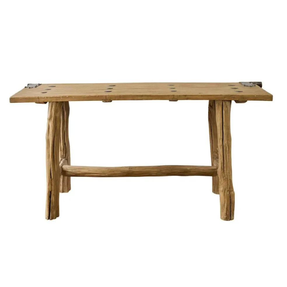 Diese außergewöhnliche Konsole wurde aus einer alten Holztür gefertigt und trägt die Spuren vergangener Jahrzehnte mit Würde. Die grobe, lebendige Holzstruktur mit ihren natürlichen Rissen und Vertiefungen lässt die Ursprünglichkeit des Ulmenholzes spüren. Metallbeschläge – teils glatt, teils mit rustikalen Nieten – veredeln die Ecken und machen aus dem funktionalen Möbel ein echtes Statement-Piece. Form, Farbe und Aussehen variiert von Stück zu Stück – denn jedes Exemplar ist ein handverlesenes Unikat. Ideal für alle, die das Echte lieben und Wert auf besondere Stücke mit Charakter legen.