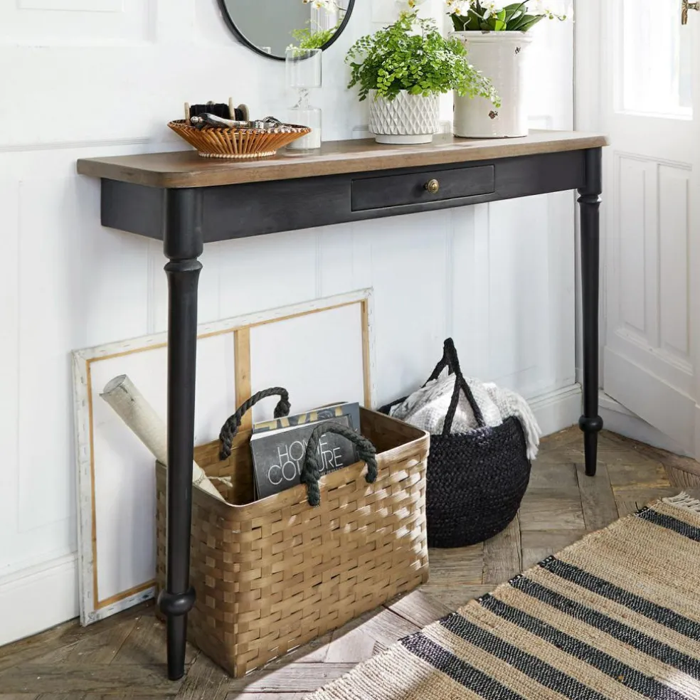 Noblesse oblige. Diesem Grundsatz zeigt sich auch diese Konsole verpflichtet und wird sich mit ihrem eleganten Äußeren wie mit ihren praktischen Fähigkeiten nützlich machen. Am besten kann sie ihre Vorzüge in kleinen Räumen, schmalen Korridoren oder in Durchgängen ausspielen, denn mit der geringen Tiefe ist sie in der Lage, sich eng an die Wand zu schmiegen und dabei nur wenig Raum zu beanspruchen, gleichzeitig bietet sie auf ihrer Platte vielen nützlichen und dekorativen Objekten einen stilvollen Platz. Wie ihre historischen Vorbilder, die seit dem 17. Jahrhundert die aristokratischen Salons Frankreichs und Italiens eroberten, wird auch diese Konsole im Handumdrehen einen festen Platz in Ihrem Wohnambiente einnehmen und Sie werden sich nicht vorstellen können, jemals auf sie zu verzichten. Klassisch und damit zeitlos schön erweist sich die Kombination aus edlem Mangoholz und handwerklich perfekter Verarbeitung, von der auch die fein gedrechselten, sich elegant verjüngenden Beine zeugen, die dem Möbelstück die zierliche Eleganz verleihen. Abgerundet wird der noble Auftritt durch die aparte Zweifarbigkeit der Kreation, bei der das dunkle Antik-Finish der Beine den warmen Naturholzton der Platte besonders schön zur Geltung bringt. Praktisches i-Tüpfelchen ist die geräumige Schublade, die sich über die gesamte Breite erstreckt und in der Sie viele Dinge griffbereit verstauen können.