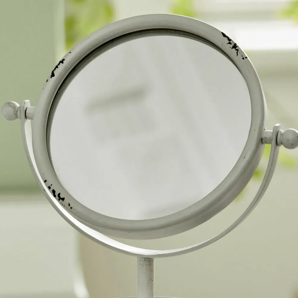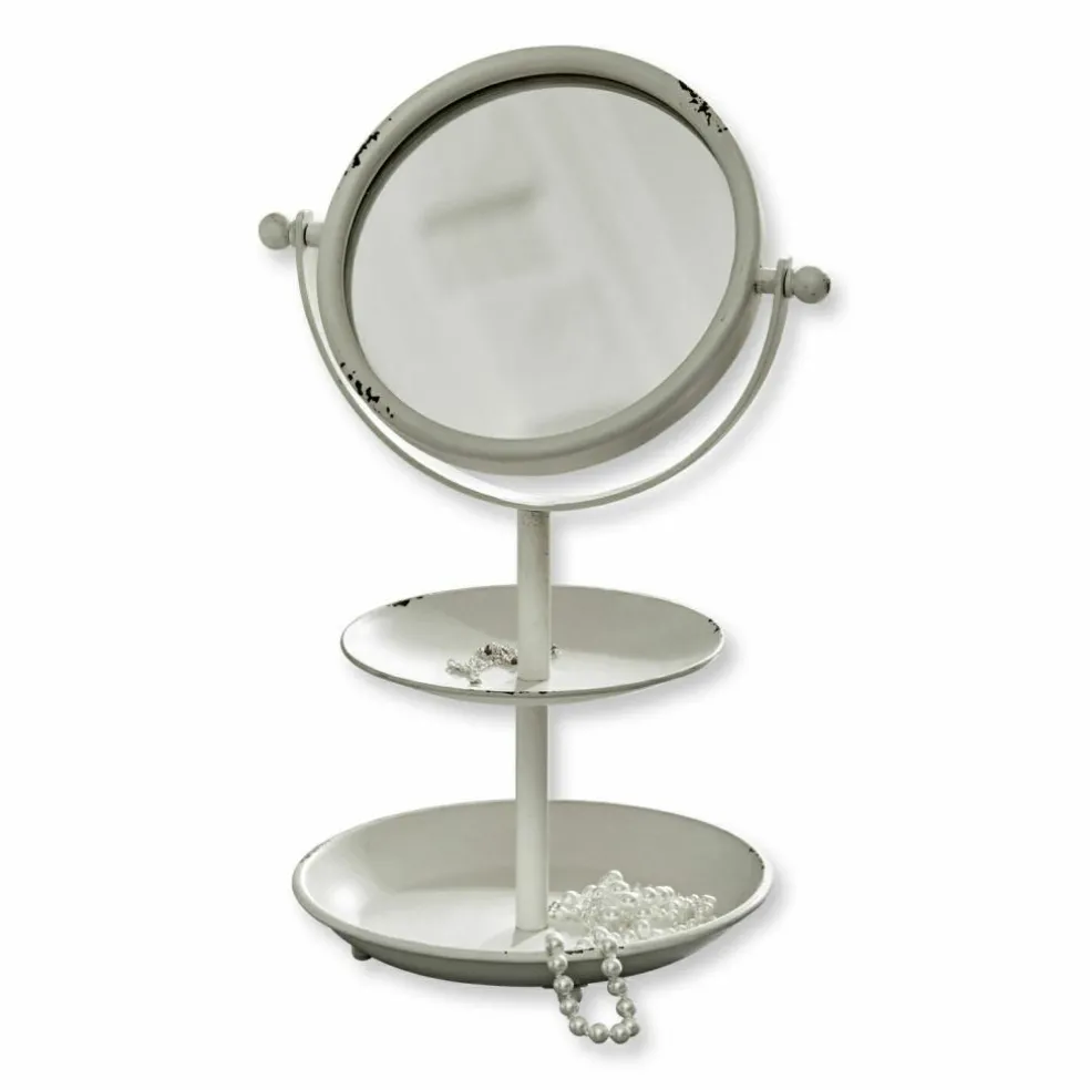 Das perfekte Accessoire für Ihre Beauty-Oase – dieser hübsche Spiegel eignet sich wunderbar für einen charmanten Schminkplatz. Das hübsche Design hat viel nostalgischen Charme. Es besteht aus Glas und Eisen mit Antik-Finish für eine hübsche Patina. Hier sind Dekoration und Funktion ideal vereint. Der reizende Spiegel ist klappbar und hat nützliche Ablagen für Schmuck und Make-up. Eine Spiegelseite bietet auch eine Vergrößerungsfunktion, sodass Sie jedes Haar und jede Wimper gut im Blick haben. Die ABlagen sind im Stil einer Etagere gestaltet. Lippenstift, Armbänder, Haarnadeln und Ohrringe finden hier wunderbar Platz, sodass Sie immer alles zur Hand haben. Zieren Sie mit dem eleganten Design Ihren Schminktisch, das Bad oder schaffen Sie eine Schminkecke auf der Fensterbank oder einer Anrichte – so können Sie zum Beispiel eine Beauty-Oase mit Tageslicht erschaffen. Der formschöne Spiegel passt sehr gut zum Shabby-Chic.