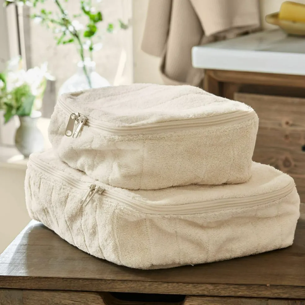 Dieses Kosmetiktaschen-Set verbindet Funktionalität mit einem Hauch von Luxus. Die Außenseite aus weichem Frottee verleiht den Taschen eine angenehm kuschelige Haptik, während das Innenfutter aus gestrickter Baumwolle für einen sanften Schutz Ihrer Kosmetikprodukte sorgt. Besonders praktisch ist die Netztasche im Inneren, die Ihnen hilft, kleinere Gegenstände geordnet zu verstauen. Ob auf Reisen oder zu Hause, diese Taschen bieten den perfekten Mix aus Komfort und Praktikabilität. Der doppelte Reißverschluss ermöglicht einen einfachen Zugriff und sicheren Verschluss, sodass Sie jederzeit bestens organisiert sind.