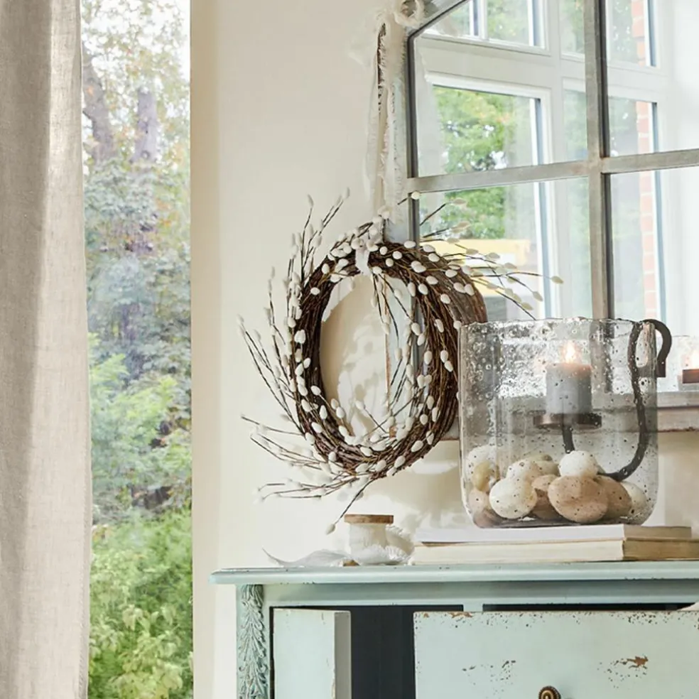 Dieser schöne Kranz sieht aus wie gerade frisch gebunden. Eine sehr naturnahe Weidenkätzchen-Nachbildung ziert die echten Kiefernzweige. Die Deko-Weidenkätzchen aus Schaumstoff und Polyester bleiben für immer frisch und hübsch, sodass Sie sich viele Jahre darüber freuen können. Der natürlich anmutende Kranz ist gelegt oder aufgehängt eine Zierde für die Wand, an Türen oder auf dem Tisch. Sie können ihn auch mit einem dekorativen Band verschönern. So adelt das attraktive Accessoire jedes Interieur – es macht sich zum Beispiel hervorragend zum Landhaus-Stil und zaubert die Natur in jeder Saison in Ihr Heim.