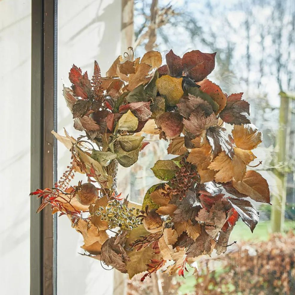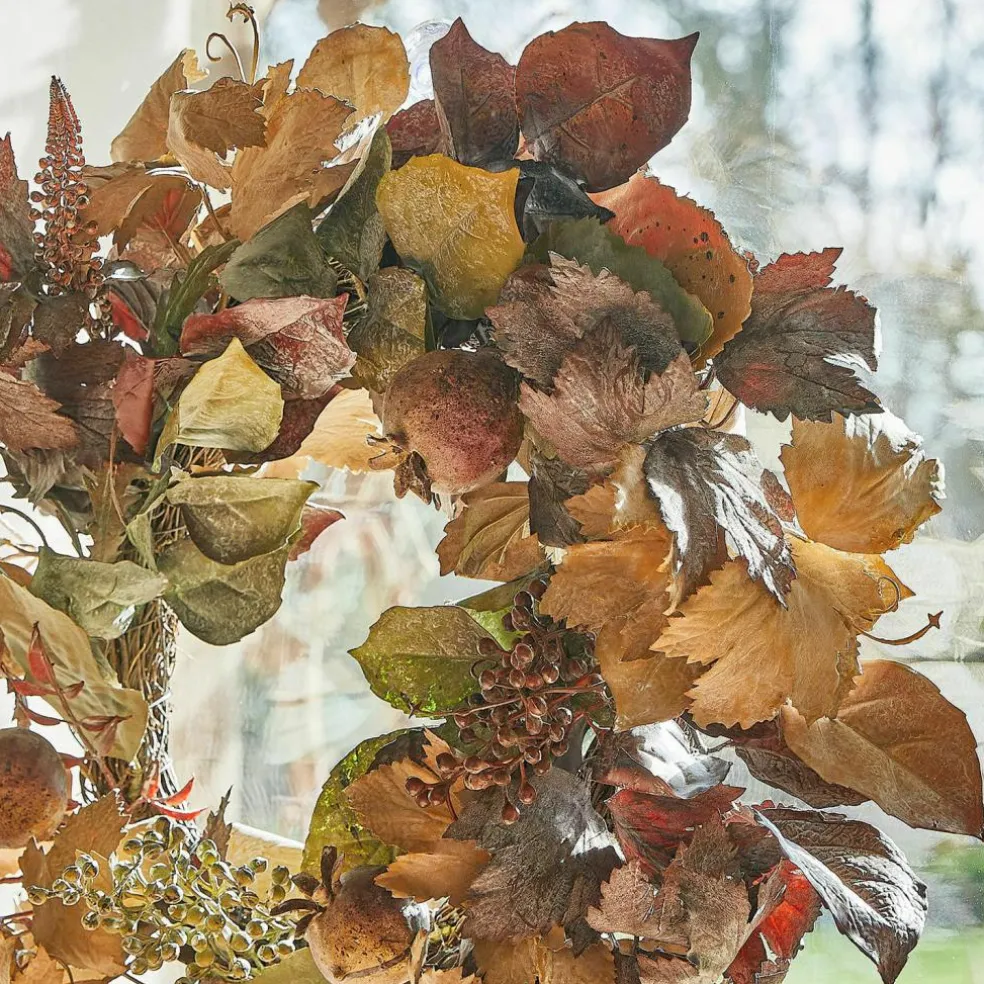 Blätter in ihrer schönsten Herbstfärbung und filigrane Holunderbeeren sind die Zutaten für diesen Deko-Kranz, der eine zauberhafte Herbsstimmung aufkommen lässt und Ihnen jedes Jahr aufs Neue viel Freude bereiten wird. Denn seine Blätter sind kunstvoll von Hand gestaltet und wirken durch die vielschichtige und natürliche Haptik nahezu naturgetreu. Zudem bleiben sie makellos in Form und Farbe und können nicht brechen. Die Basis für das hübsche Herbstszenario bildet ein gebundener Kranz aus echtem Rattan. Ein stimmungsvoller Akzent für die Eingangstür, auf der Kaminkonsole oder auf der Gästetafel – ergänzt mit dem Lichterglanz einer Stumpenkerze.