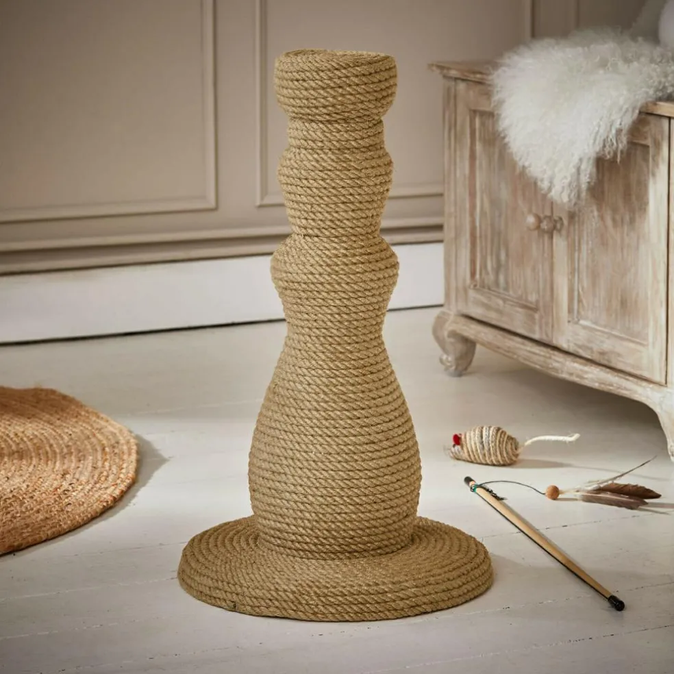 Wer sagt, dass Funktionalität und Ästhetik sich ausschließen müssen, kennt diesen außergewöhnlichen Kratzbaum noch nicht. Die geschwungene Silhouette erinnert an eine kunstvolle Skulptur, während das naturbelassene Juteseil spannungsreich um den soliden Mahagonikern gewunden ist – ein harmonisches Zusammenspiel von Material und Form. Katzen finden hier ein Objekt, das sie mit Stolz beanspruchen können. Und auch für die menschlichen Mitbewohner wird dieser Kratzbaum zum stilvollen Statement – charmant natürlich, angenehm unaufdringlich und dabei unverkennbar besonders.