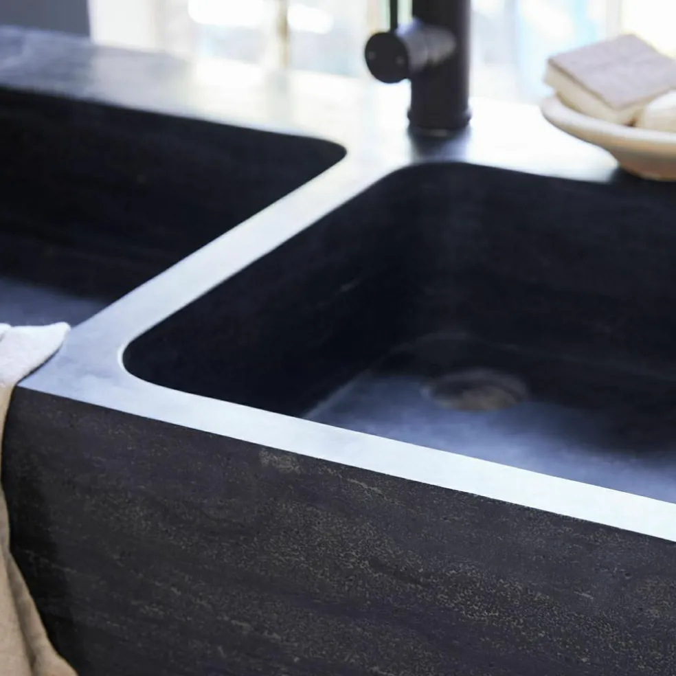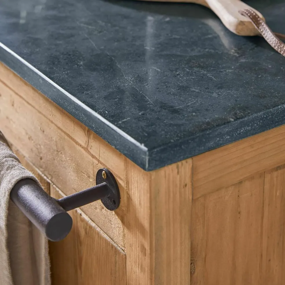 Erleben Sie die perfekte Symbiose aus traditionellem Handwerk und modernem Design mit dieser einzigartigen Küche im 4er Set. Die Kombination aus wiederaufbereitetem Tannenholz und einer Arbeitsplatte aus echtem Blaustein verleiht Ihrer Küche einen rustikalen, aber dennoch anspruchsvollen Look. Die natürliche Maserung des Holzes, gepaart mit der kühlen Eleganz des Steins, schafft ein harmonisches Ambiente, das sowohl optisch als auch haptisch begeistert. Jedes Element dieser Küche ist frei stellbar und lässt sich somit flexibel an Ihre individuellen Bedürfnisse und Raumgegebenheiten anpassen. Die integrierte Eisenleiste bietet eine praktische Lösung zum Aufhängen von Küchenutensilien, Handtüchern oder Dekorationen und fügt gleichzeitig einen industriellen Touch hinzu, der das Gesamtbild abrundet. Mit dieser Küche holen Sie sich nicht nur einen funktionalen Arbeitsbereich, sondern auch ein Stück Natur und Nachhaltigkeit in Ihr Zuhause. Das 4er Set besteht aus folgenden Einzelartikeln, die Sie auch separat erwerben können: 24341 Schrank, 24342 Spülenschrank, 24344 Kommode und 24413 Küchenschrank.