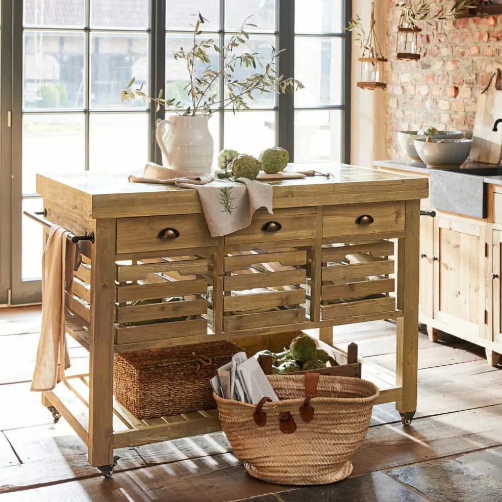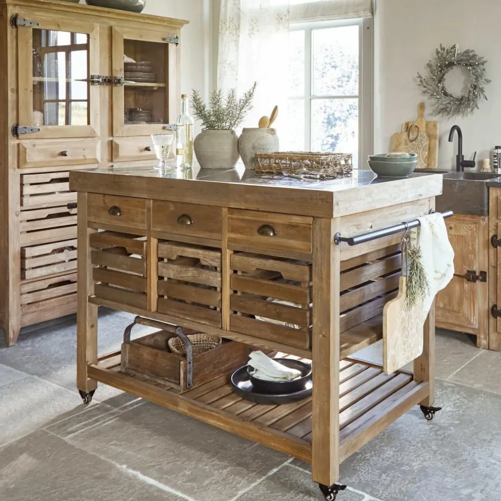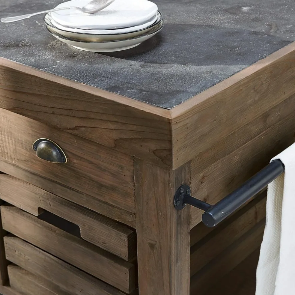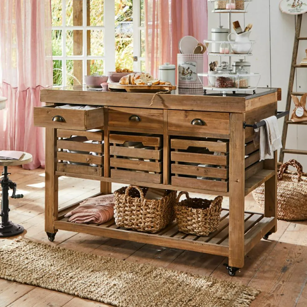 Diese Kücheninsel sorgt beim Kochen mit Freunden für ein geselliges Ambiente und lässt sich außerdem ganz bequem von der Küche ins Esszimmer rollen. So haben sie eine zusätzliche Ablage parat und sparen Platz auf dem Küchentisch. Die Funktionalität wird von drei offenen Kisten und Schubladen unterstrichen, die von beiden Seiten frei zugänglich sind. Das prächtige Schmuckstück wird in Handarbeit aus Massivholz gefertigt – wiederaufbereitetes Tannenholz, um präzise zu sein. Eine nachhaltige Produktion und ein besonderer Qualitätsanspruch stehen klar im Fokus. Perfekt abgerundet wird das hochwertige Design von einer außerordentlich attraktiven Natursteinplatte.