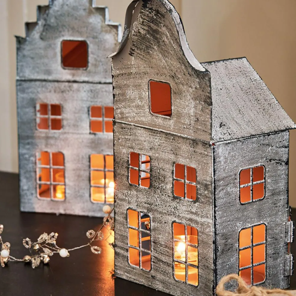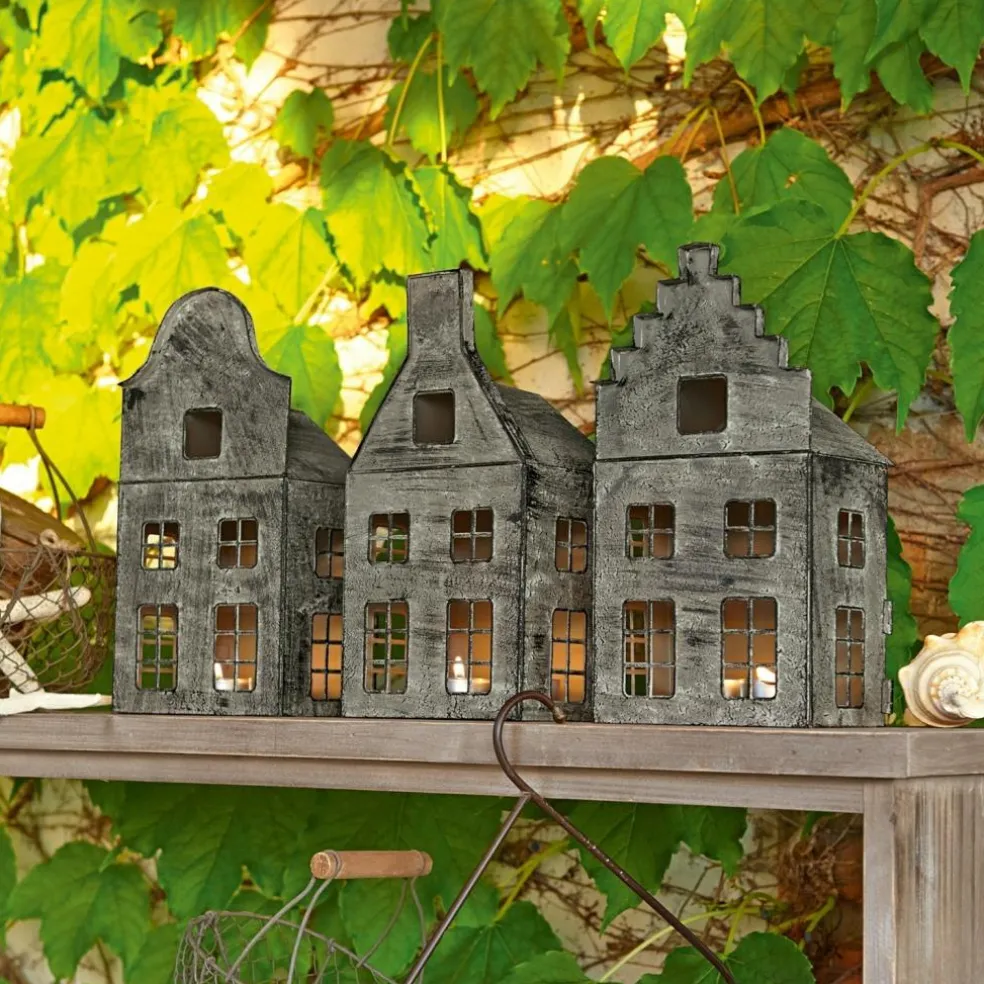 Kaum etwas wirkt idyllischer und anheimelnder als der Lichterschein der aus belebten Häusern fällt. Und mit diesen Laternen im 3er Set holen Sie sich das Idyll jetzt ganz einfach nach Hause. Die Windlichter in drei verschiedenen Formen geben zusammen eine dekorative Häuserzeile ab, sind jedoch auch einzeln ein echtes Highlight für drinnen und draußen. Gefertigt und handbearbeitet aus Eisen wurden die Häuser im Kleinformat mit einer dekorativen Antik-Lasur versehen. Übrigens: In jede Laterne passt je eine kleine Stumpenkerze oder ein großes Teelicht – sie bietet aber auch den passenden Rahmen für allerlei kreative Deko-Ideen. Lassen Sie Ihrer Fantasie freien Lauf – das Ergebnis wird in jedem Fall sehenswert.