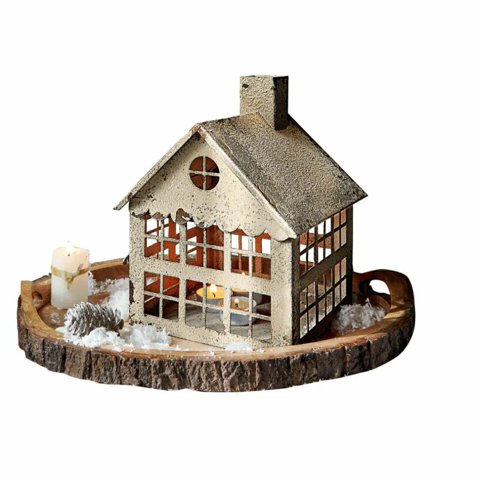Wie aus einer anderen Zeit wirkt dieses kleine Eisenhaus, dessen Patina von frostigen Winternächten und warmem Kerzenschein erzählt. Die rustikale Oberfläche, mit ihrem gewollt gealterten Finish, unterstreicht den nostalgischen Charakter und erinnert an verschneite Abende im Kerzenlicht. Sobald ein Teelicht im Inneren entzündet wird, erwachen die ausgestanzten Fenster zum Leben: Zarte Lichtstrahlen tanzen über Wände und Möbel, tauchen den Raum in ein wohlig warmes Ambiente. Ob einzeln platziert oder als Teil eines winterlichen Ensembles – dieses Lichterhäuschen erzählt seine ganz eigene Geschichte.