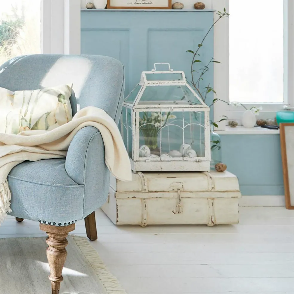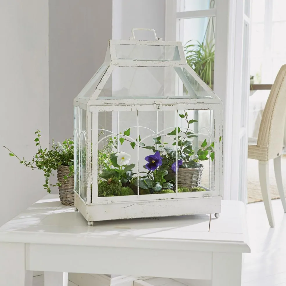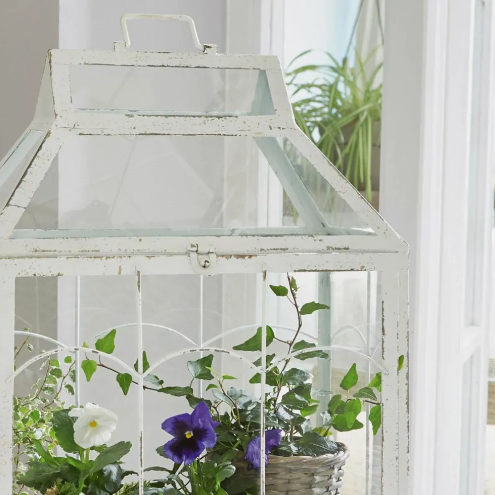 Dieses wunderschöne Stück ist absolut vielseitig und kann als Kleingewächshaus, Laterne oder Mini-Vitrine verwendet werden. Mit Deko-Objekten lassen sich sogar kleine Geschichten erzählen. Zum Beispiel über Ostern oder die Weihnachtszeit, wenn man Häschen, Engel oder Krippenfiguren präsentiert. Sie können einen kleinen Kräutergarten darin anlegen oder einfach ein paar Kerzen oder LED-Girlanden hineinstellen. Die dekorative Laterne ist aus Zinn gefertigt und punktet mit filigranen Details. Das handgemachte Shabby-Finish weist feine Unregelmäßigkeiten und Altersspuren auf, die für authentisches Vintage-Flair sorgen. Eine hochwertige Verglasung wurde perfekt an den Rahmen angepasst. Die Front lässt sich nämlich aufklappen, sodass sie bequemen Zugang zum Inneren erhalten. Ein dezenter Verschlussmechanismus sorgt dafür, dass sich die Tür nicht versehentlich öffnet. Ein charmanter Griff erlaubt den sicheren Transport, zum Beispiel vom Innen- zum Außenbereich.