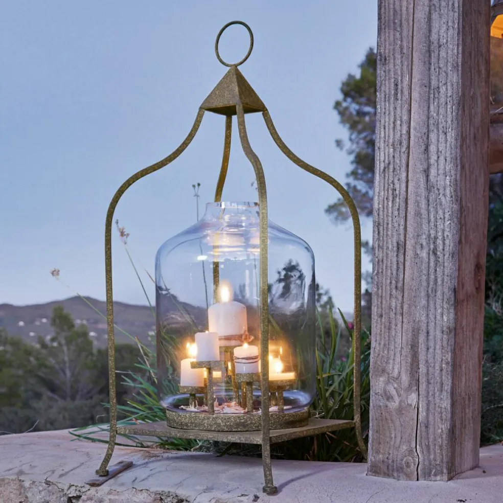 Ein absolutes Liebhaberstück, das mit einem orientalisch angehauchten Design und wirklich smarten Features punktet. Da diese Laterne mit einem Tragering und vier formschönen Füßen ausgestattet ist, kann sie auf den Boden, einen Beistelltisch oder eine Kommode gestellt werden. Sie können das Vintage-Schmuckstück aber auch aufhängen und dank der gläsernen Glocke ist das Ganze windgeschützt. Kurz: Die ideale Laterne für innen und außen. Das filigrane Gestell ist aus Stahl gefertigt und mit einem besonderen Antik-Finish im Shabby-Look überzogen. Die wunderschöne Gestalt umschließt und schützt den gläsernen Korpus, der sich ganz einfach entnehmen lässt. So lassen sich die sieben innenliegenen Halterungen bequem mit Teelichtern und Kerzen bestücken.