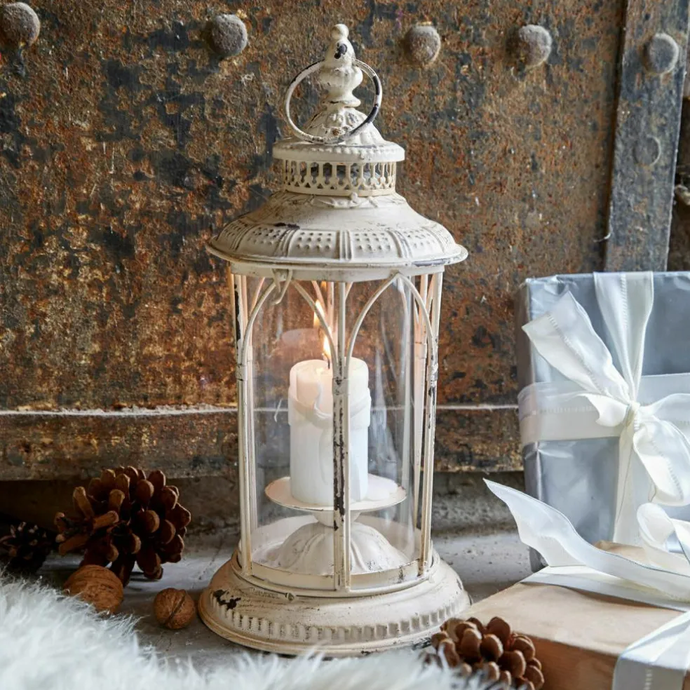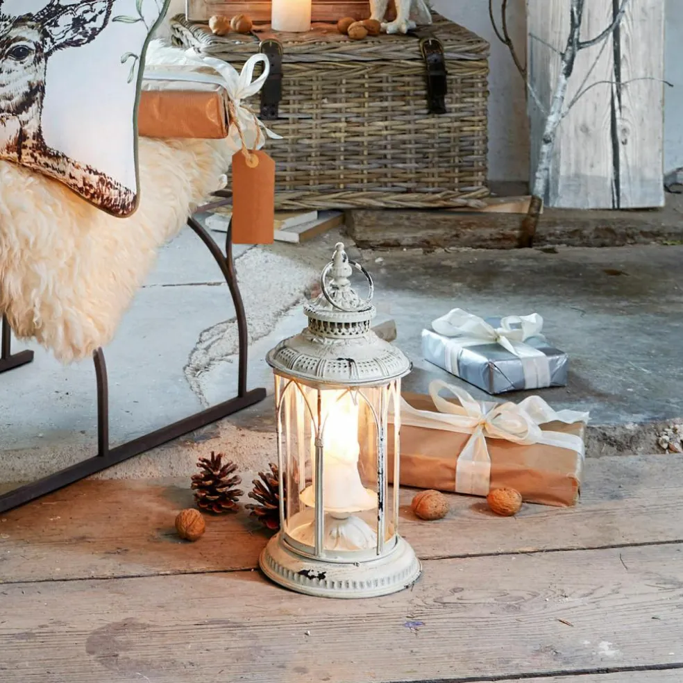 Vintage-Charme pur – diese kunstvolle Laterne ist ein echtes Lieblingsstück für alle, die den Shabby-Look lieben. Sie besteht aus Eisen mit sehr aufwendig aufgebrachtem Antik-Finish und einem Glas-Einsatz, das die Flamme vor Wind schützt. Das stilsichere Design ist sehr dekorativ und charmant. Es adelt wirklich jeden Raum mit einem Hauch Vintage-Flair, vielleicht am Fenster oder auf dem Boden platziert. Entzünden Sie darin ein Teelicht oder eine Stumpenkerze und erleben Sie eine geborgene, heimelige Atmosphäre, die das ganze Jahr über ein Genuss ist. An dem Ring oben lässt die formschöne Laterne sich sehr einfach verstellen oder auch aufhängen. Schmücken Sie den Tisch, eine Anrichte oder auch den Fußboden damit und entscheiden Sie nur noch, welcher Raum sich auf dieses nostalgische Accessoire freuen darf – der Flur, das Schlafzimmer oder doch die Wohnräume?