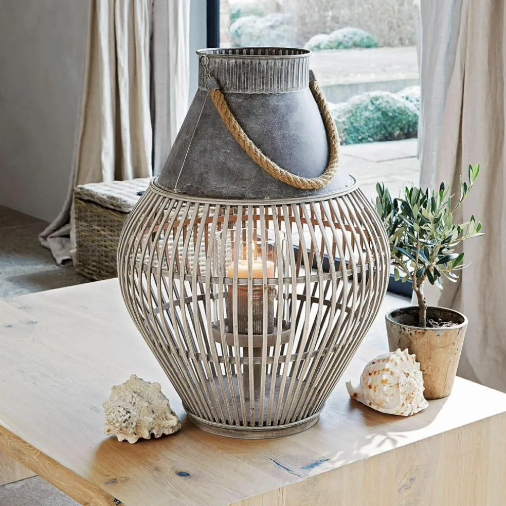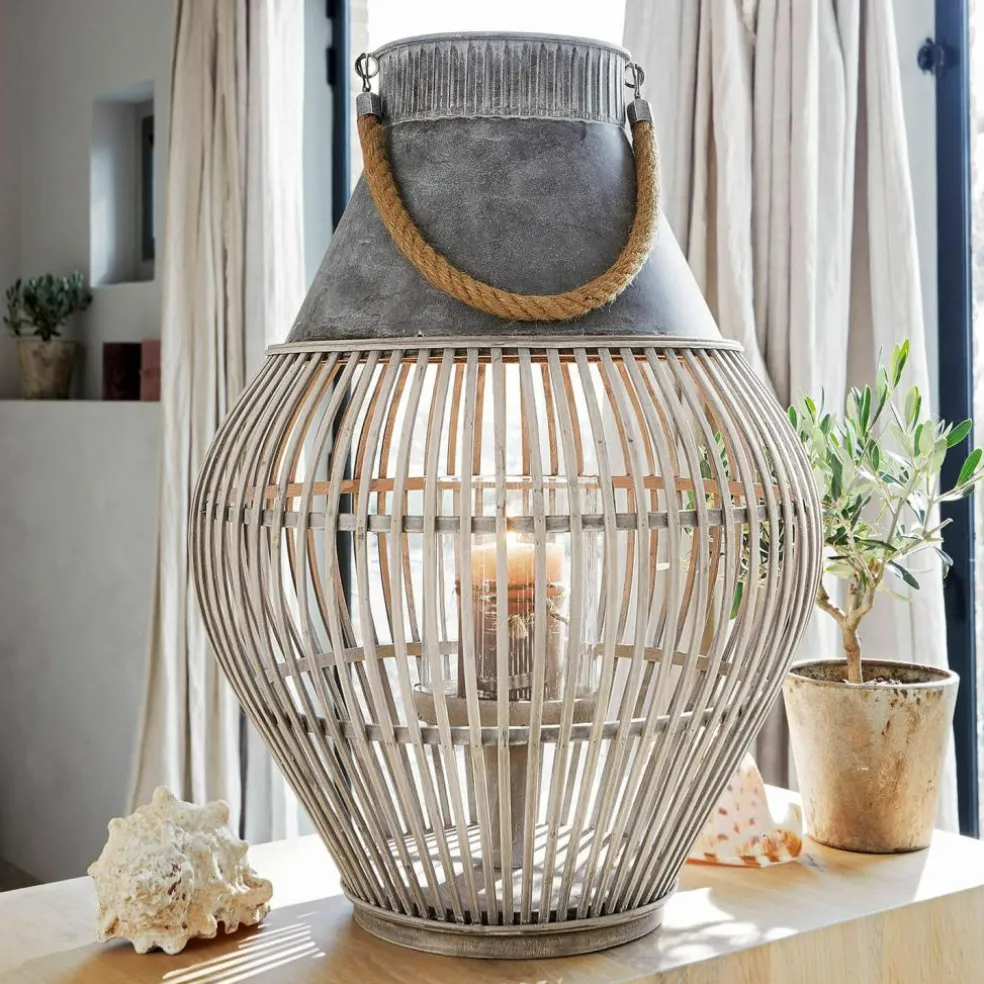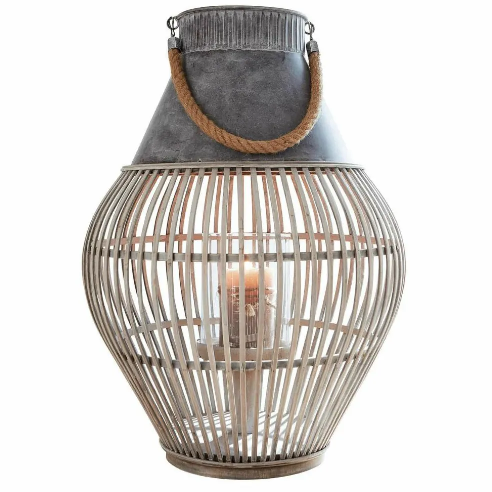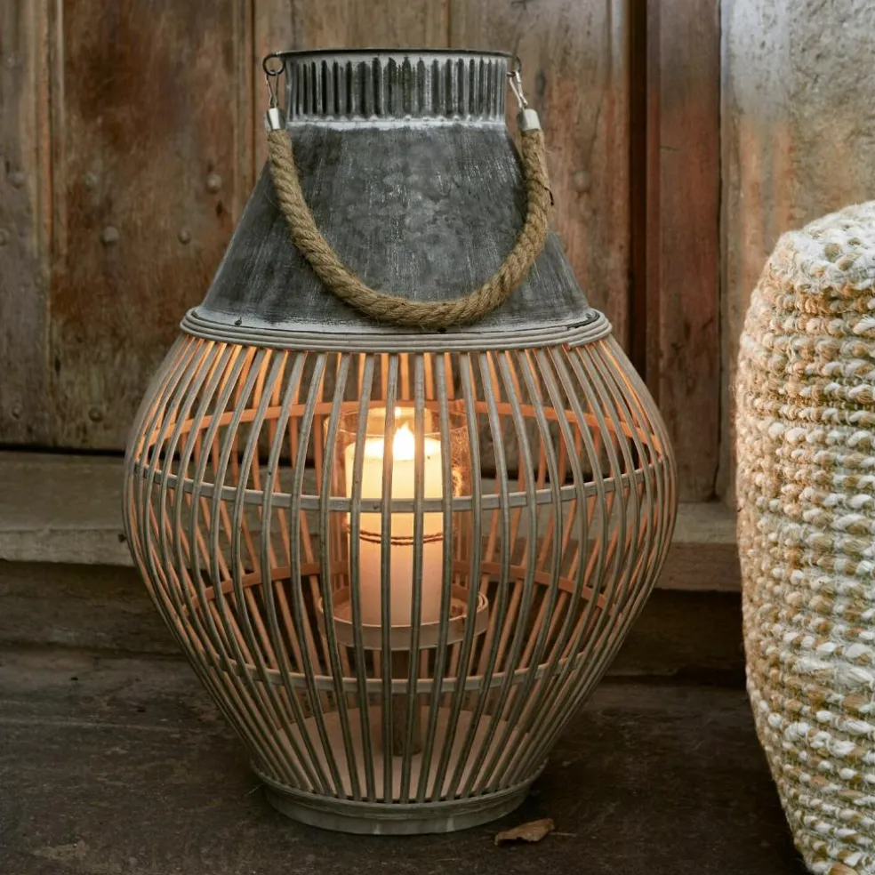 Nichts macht den entspannten Abend auf der Terrasse oder die Sommer-Party im Garten stimmungsvoller, als eine indirekte Lichtquelle. Diese Laterne im trendigen Boho-Style ist auch noch ein äußerst dekorativer Hingucker. So reizvoll ist ihr handgefertigtes Design mit geflochtenem Bambusgestell im unteren Bereich und einem Zinkaufsatz im oberen Teil. Ein Glaseinsatz im Inneren verleiht der eingesetzten Kerze sicheren Halt. Abgerundet wird das Modell durch das robuste Aufhängeseil aus Jute, das auch abnehmbar ist. Ein stilvoller Lichtakzent, der Ihr Ambiente im Bohème-Stil oder Ethno-Look perfekt unterstreicht – ob drinnen oder draußen – stehend oder hängend. Eine Kerze ist im Lieferumfang nicht enthalten, so bleibt die Auswahl Ihnen überlassen.